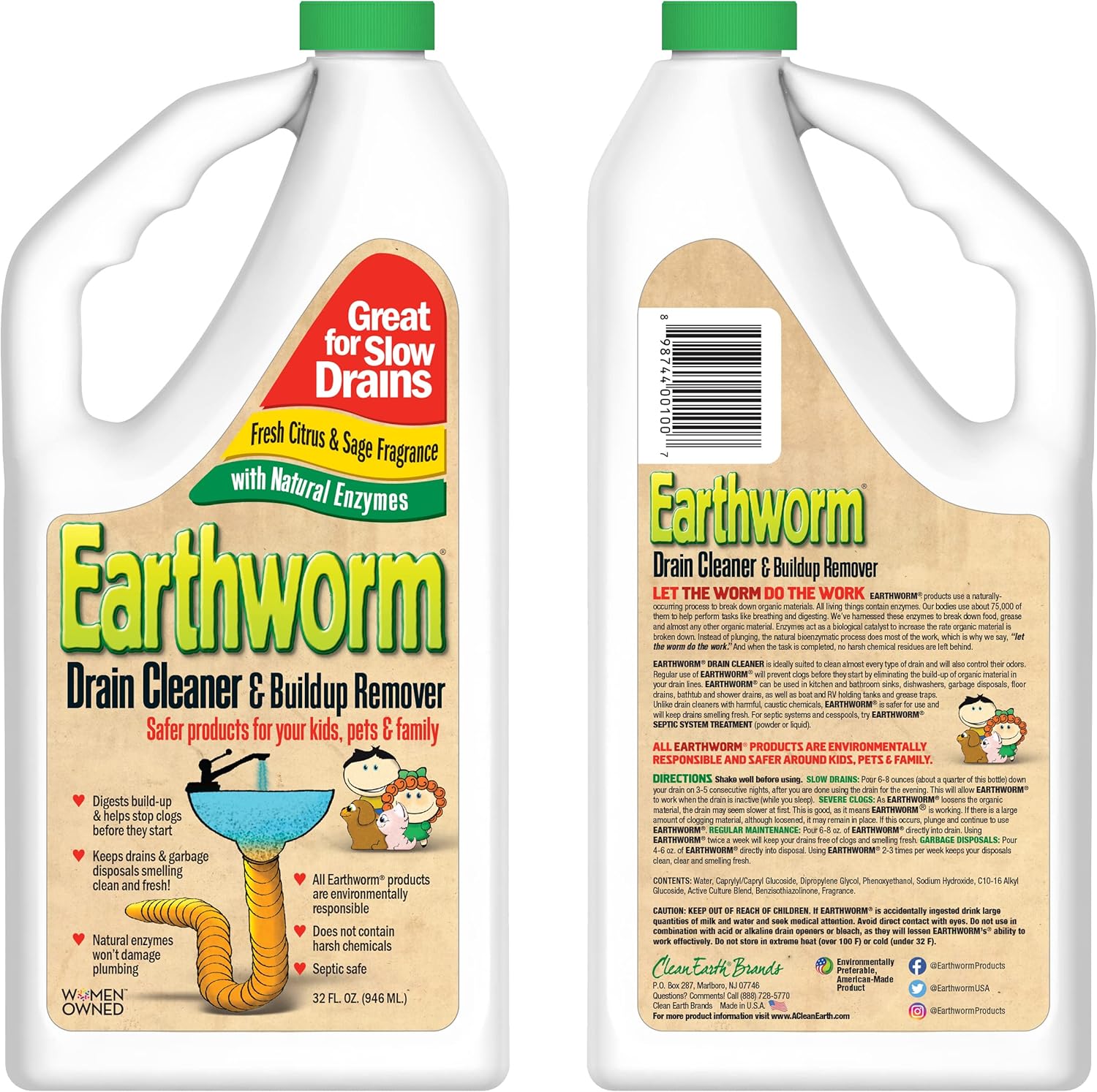 Earthworm Drain Cleaner - Clog Remover - Drain Opener/Deodorizer - Natural Enzymes, Safer for Families, Environmentally Responsible - 32 fl oz
