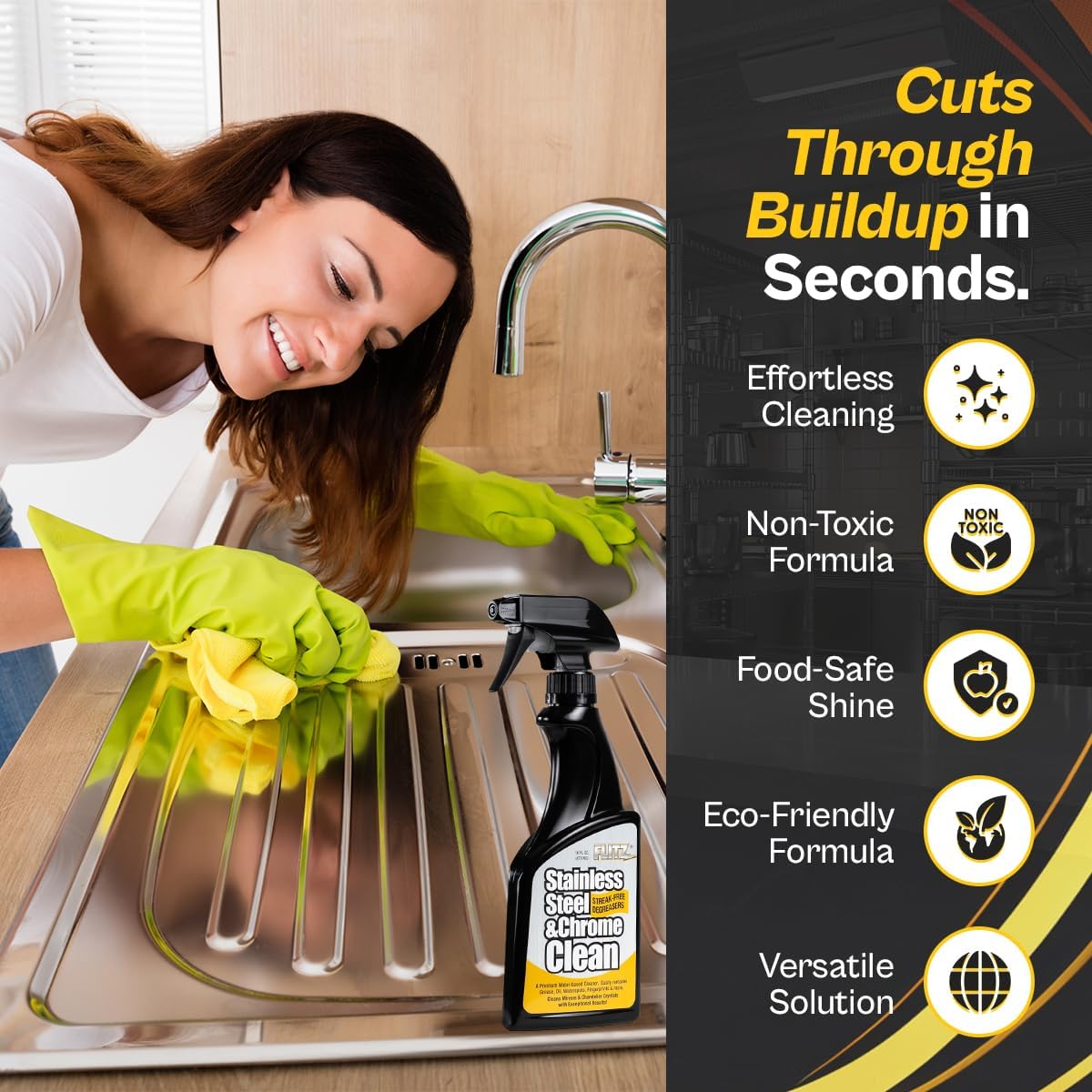 - CUTS THROUGH GRIME - Effortlessly wipe away grease, fingerprints, water spots, and everyday dirt in seconds. Our stainless cleaner for appliances cuts through tough buildup without leaving any streaks, restoring your surfaces with minimal effort
