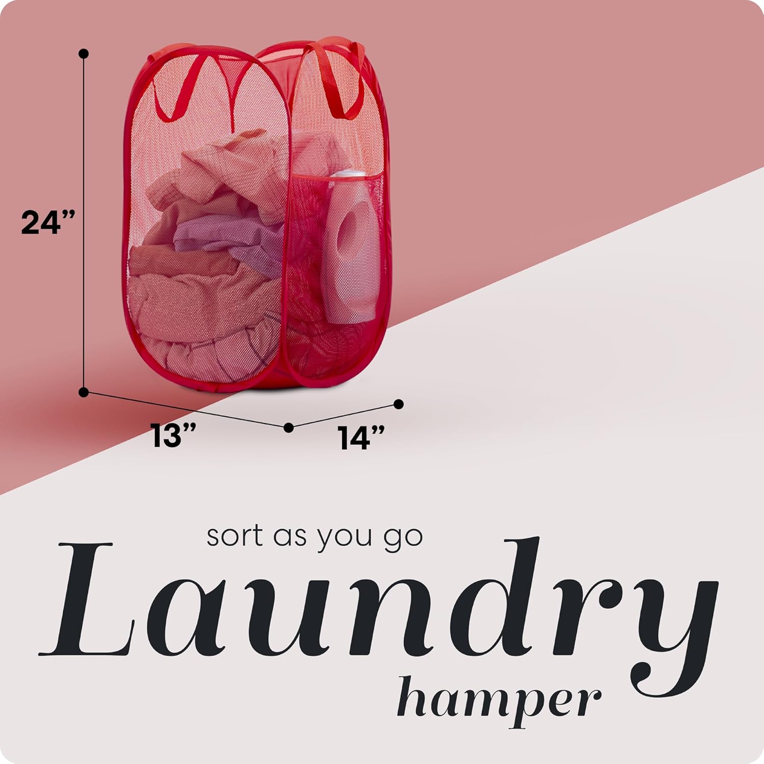 Handy Laundry Collapsible Mesh Pop Up Hamper with Wide Opening and Side Pocket - Breathable, Sturdy, Foldable, and Space-Saving Design for Clothes and Storage (Red)