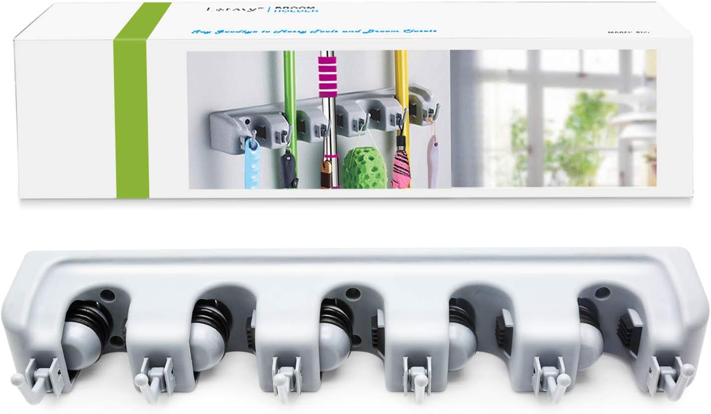 LETMY Broom Holder Wall Mounted - Mop and Broom Hanger Holder - Garage Storage Rack & Garden Tool Organizer - 5 Position 6 Hooks for Home, kitchen, Garden, Tools, Garage
