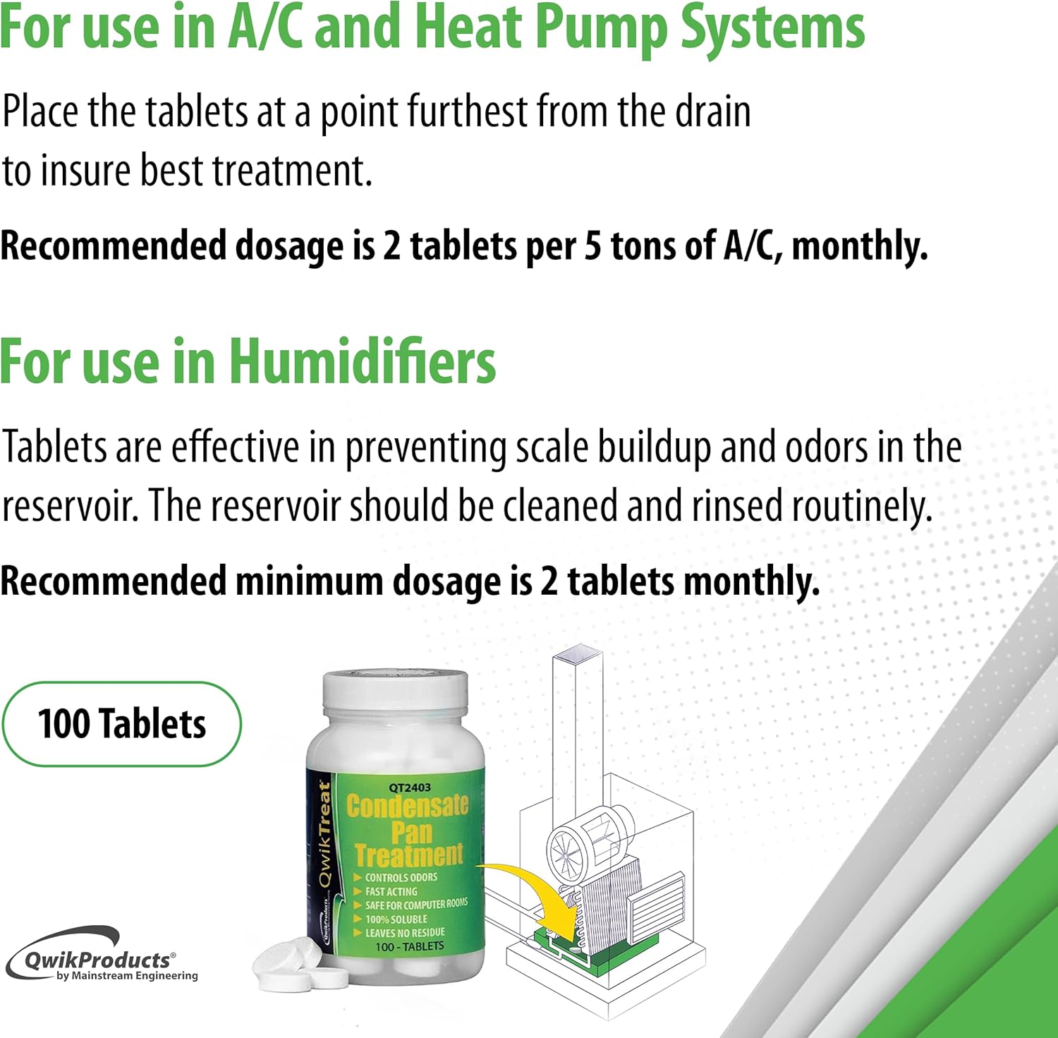 QwikTreat Condensate Pan Treatment Tablets, AC Drip Pan Tablets Air Conditioner Drain Line Cleaner, Control Odors, Overflow and Water Damage, 100 Tablets