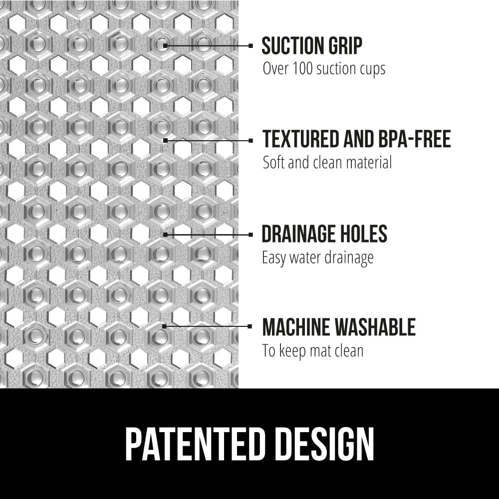 - PATENTED DESIGN WITH POWERFUL SUCTION GRIP: a shower mat designed to securely stay in place; the patented mat features hundreds of suction cups that effectively help secure the mat to your tub or shower floor