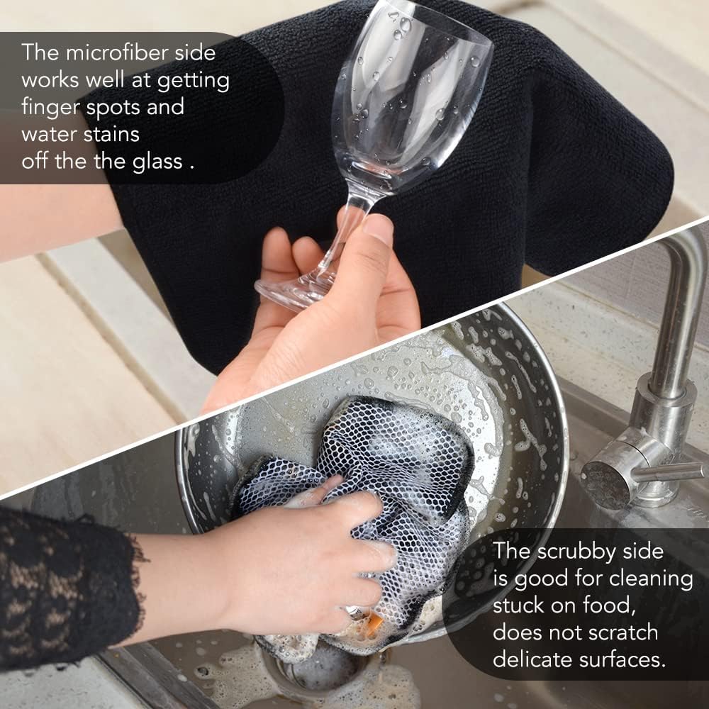 - DISH RAGS FOR KITCHEN CLEANING WITH POLY SCOUR SCRUBBING SIDE: One side is microfiber and the other side is mesh. The microfiber side works well at getting finger spots off the stainless steel appliances and the glass front of fridge or stove, microwave; the scrubby side is good for cleaning stuck on food without having to grab your scraper and does not scratch delicate surfaces either