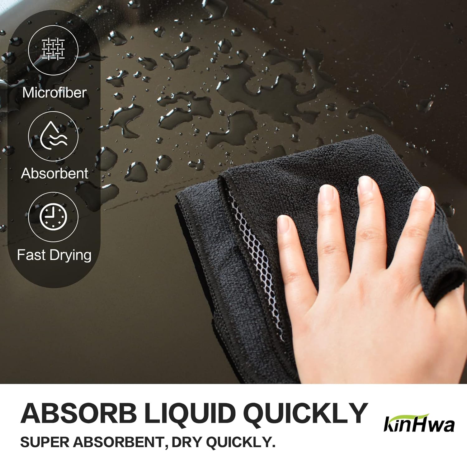 KinHwa Kitchen Washcloths for Dishes Absorbent Microfiber Dish Cloths Quick Dry Dish Rags with Poly Scour Scrub Side Ideal for Kitchen Cleaning (Black, 12inchx12inch 9 Pack)