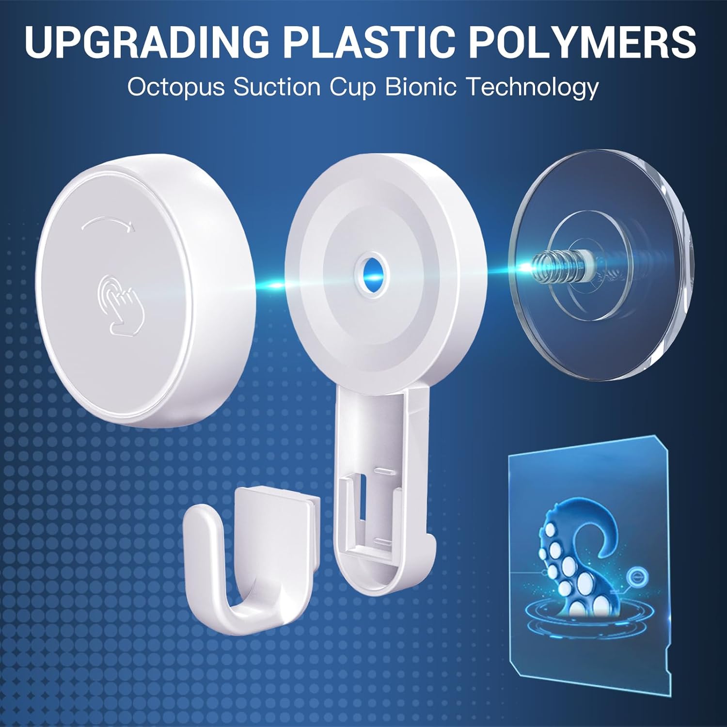 - 【EASY & QUICK TO INSTALL WITHOUT TOOLS 】– No tools, no screws and no drilling holes on the wall by using the vacuum suction hooks. Simply choose a smooth surface, peel off the film and push the hook center hard .Then turn the knob to the right until it is completely tight. Easy install and never fall off. With a 360-degree rotation design, our strong Suction Cup Hooks for Shower allow you to feel free to stick in any direction, don't worry about crooked.