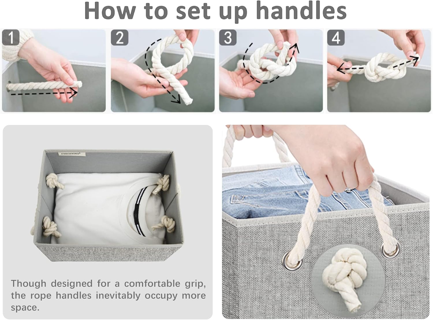 - Closet baskets feature two soft rope handles for comfortable grasping and easy carrying.