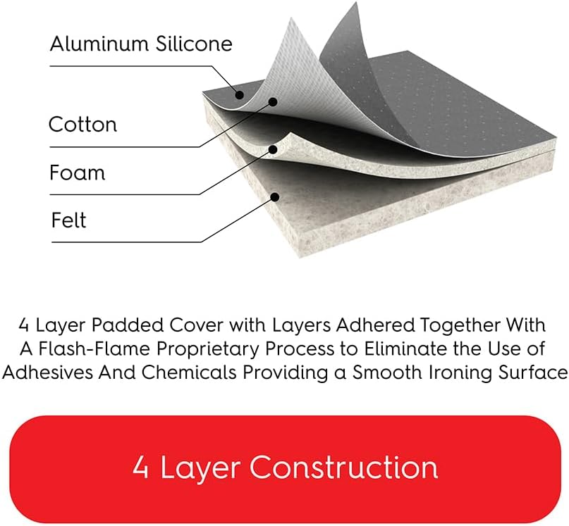- DURABLE: Heavy duty ironing board cover with extra thick 4 layer padding with aluminum, an inner foam layer and felt under padding. Cover is scorch, water and stain resistant for long lasting use