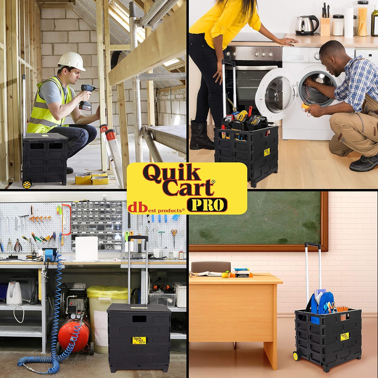 dbest products Quik Cart Pro Wheeled Rolling Crate Teacher Utility with seat Heavy Duty Collapsible Basket with Handle, Black