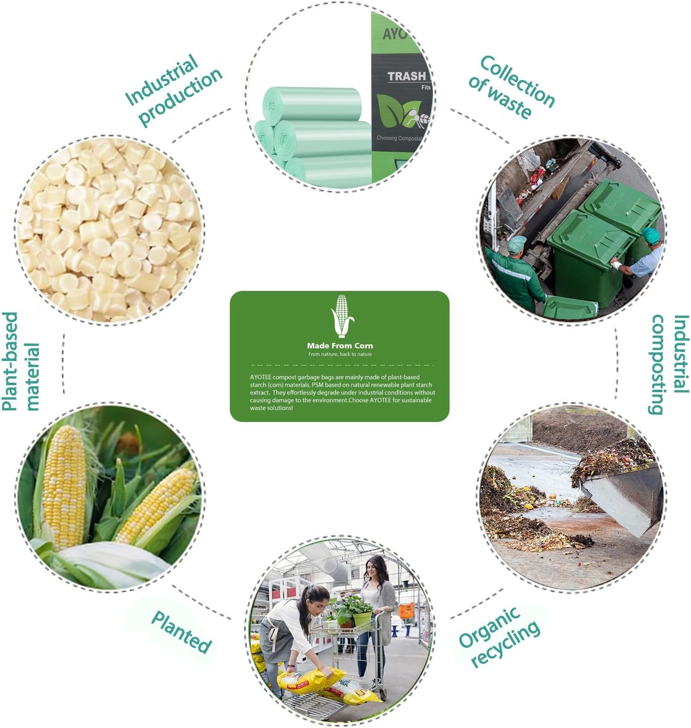 - Compost Trash Bags: The main materials for our small trash bags are made of Plastarch material(PSM), which is based on natural renewable plant starch extract. compostable, meets ASTM series standards. These small compost bags can be rapidly degraded in municipal industrial composting facilities (at 50-60°C constant humidity), to avoid harm to the environment