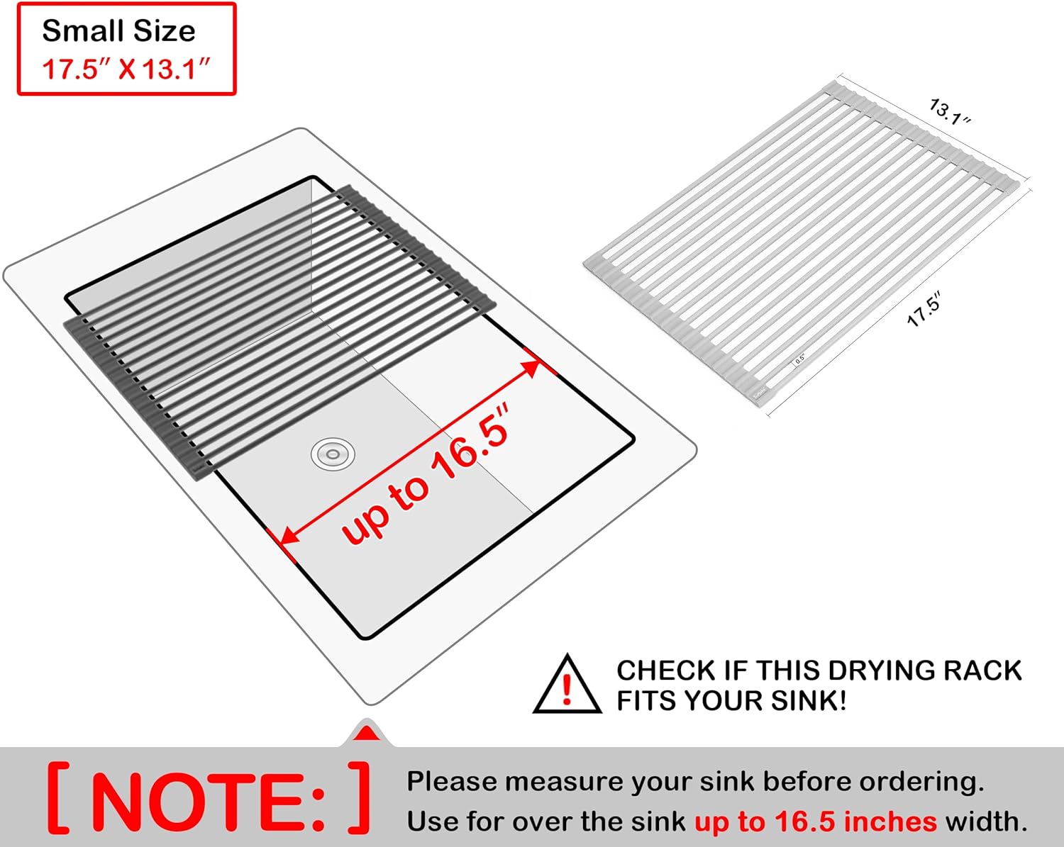 - Small Size, 17.5 x13.1 inches. Use for over the sink up to 16.5 inches width. [*** NOTE * - Please measure your sink before ordering. If your sink is wider than 16 inches please order a larger model *** ]. High-end quality, made of FDA food safe grade silicone wrapped stiff metal steel rods.
