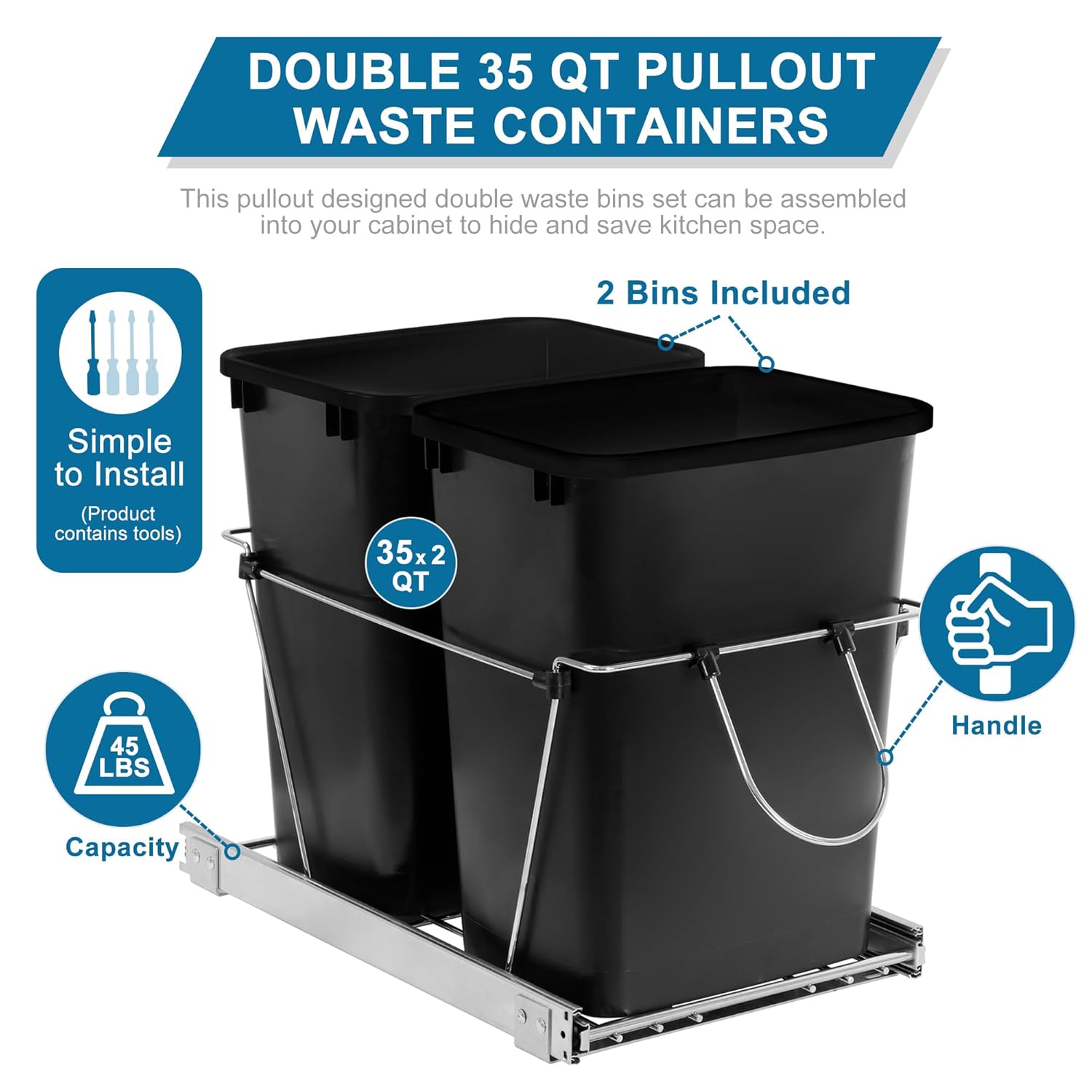SUPER DEAL Double 35-Quart Pull Out Trash Can Under Cabinets Under Sink Garbage Sliding Waste Bin Container Recycling Bins with Chrome Wire Bottom Mount 44 lbs Load Capacity, Black