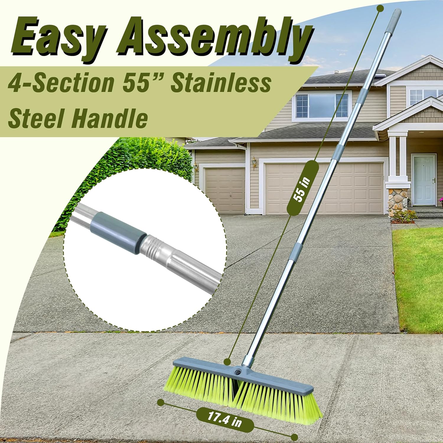 - Efficient Cleaning: The 45-degree connection between the brush head and metal joint ensures smooth sweeping. This means that the outdoor broom does not have to be tilted when brushing and all bristles are in full contact with the floor.