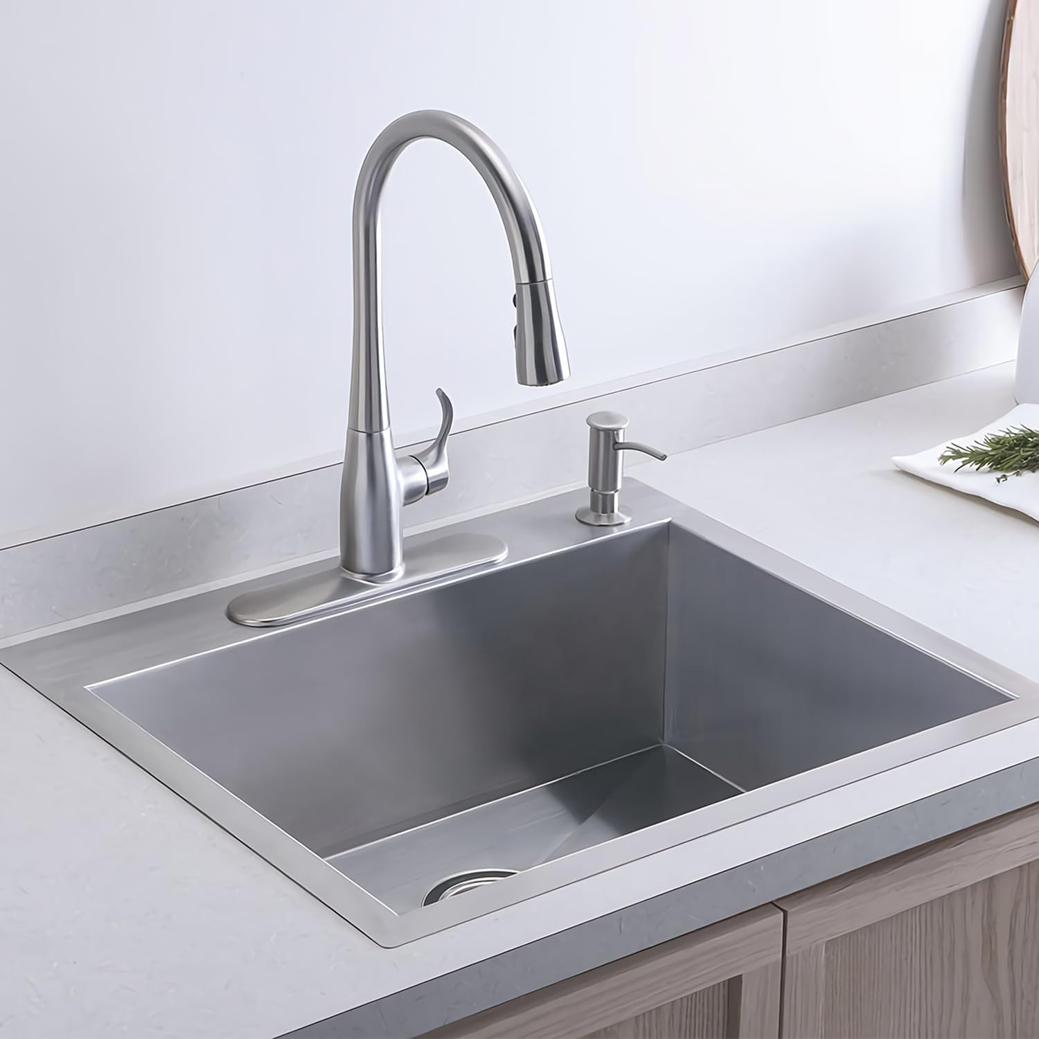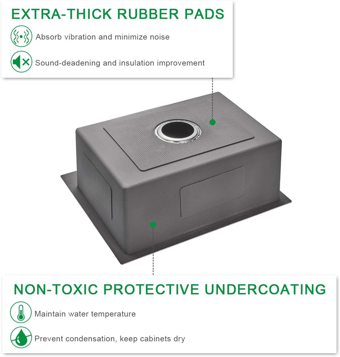- 【Sound-proof Kitchen Sink】Sound-absorption undercoating and sound-dampening rubber pads made this quietest drop in sink. Benefits: ① Minimizes water drumping sound and reduces vibration; ② Reduces condensation on the underside of sink, keeps cabinets dry and clean