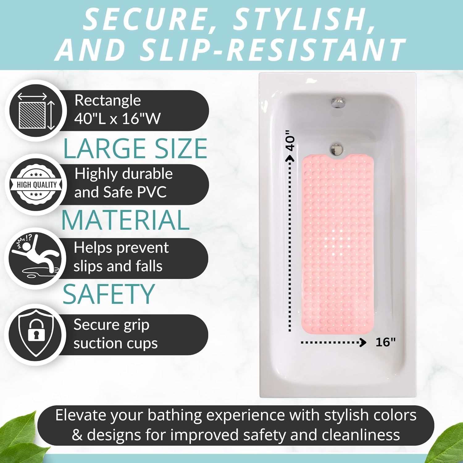 ENKOSI Bath Mat - Large Non Slip Bathtub & Shower Mat - Extra Long 40 x 16 Inch Bathroom Mats for Tub Nonslip Anti Slip Bathmats (40x16 Baby Pink 1-Pack)