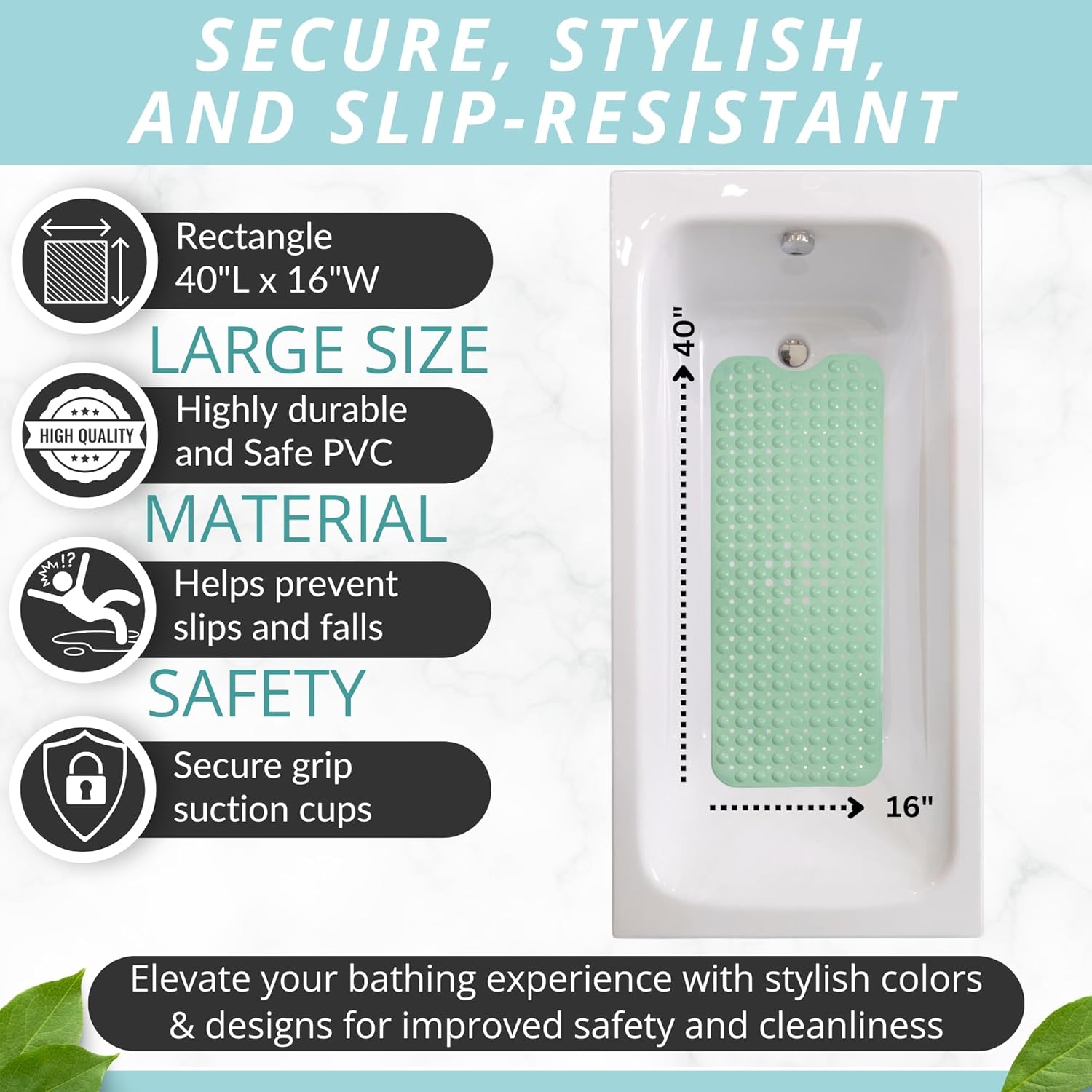 - Who Needs Slippery & Small Rubber Mats that put your safety at risk? This ergonomic shower mat comes in extra large, a full 40" x 16" size, to protectively hug your bathtub floor and prevent accidental falls
