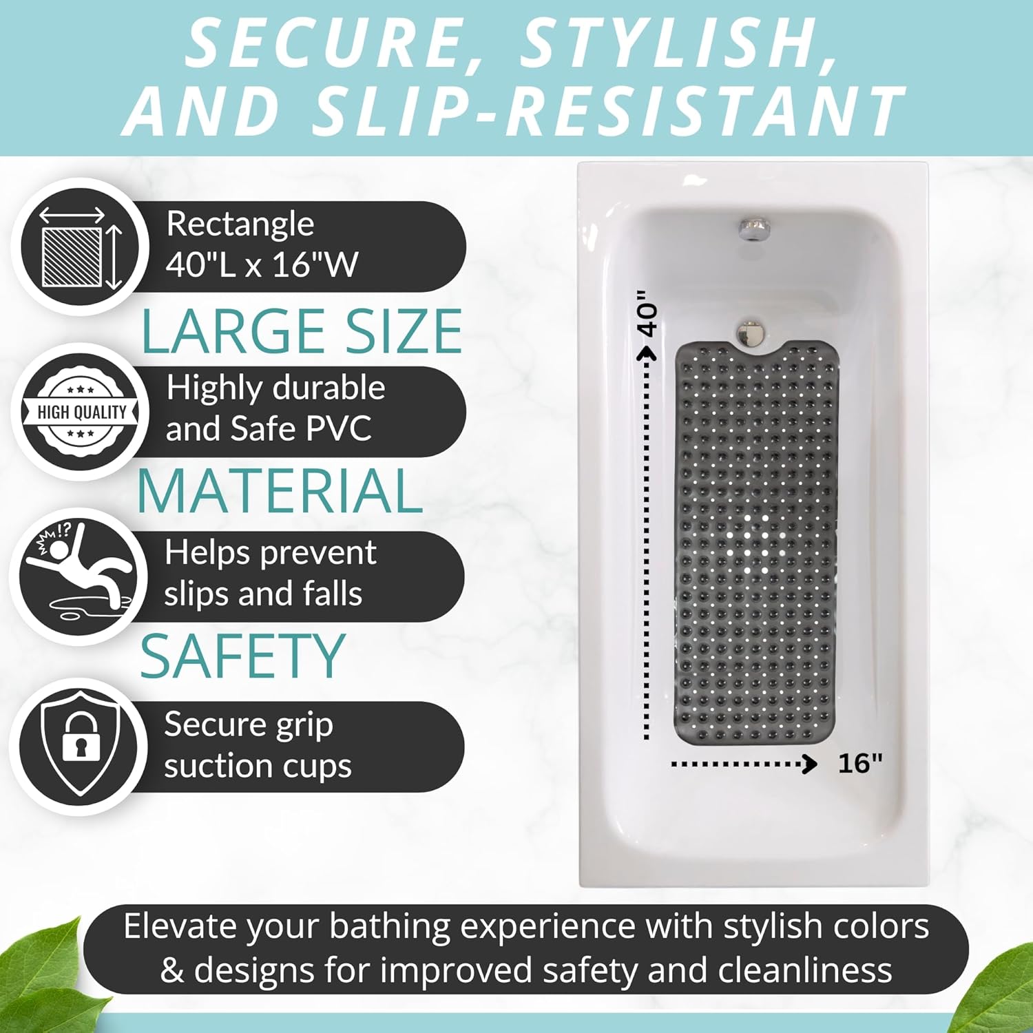 - Who Needs Slippery & Small Rubber Mats that put your safety at risk? This ergonomic shower mat comes in extra large, a full 40" x 16" size, to protectively hug your bathtub floor and prevent accidental falls