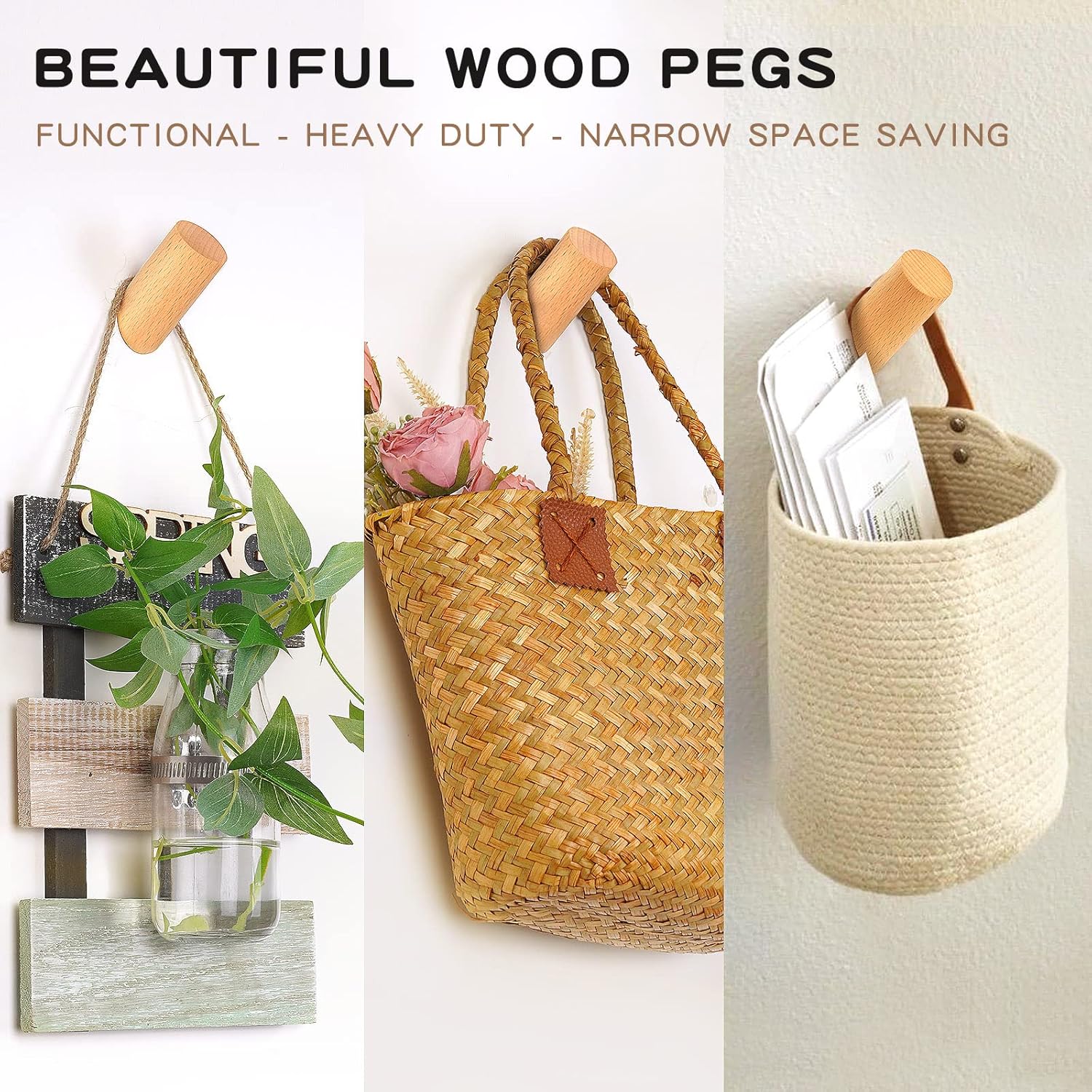 - SMALL HOOK BUT CAPABLE: Solid wood construction with wall mounted hardware, small but capable, it handles a lot of weight, and holds up to 35 lbs. each. In the winter, we hang heavy coats as well as heavy purses; In the summer, we hang our hat collection as well as swim suits. It holds everything in one place easily and securely. Never falls off