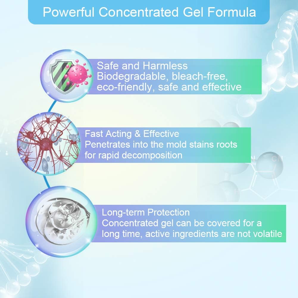 - Safe For Virtually Any Surface:The mold stain remover gel is bleach-free,non-acidic,biodegradable, and eco-friendly.The odor is much lower than ordinary spray cleaners,no strong pungent smell.Keep the space ventilated during use to let fresh air circulate,always follow the step-by-step instructions provided to achieve the best cleaning results.Do not mix with other cleaning products.