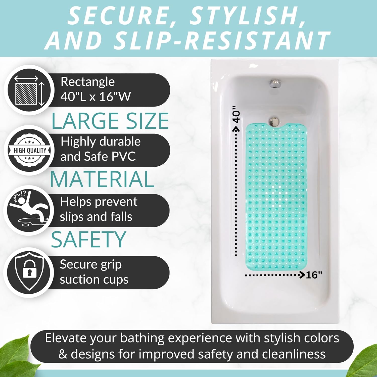 ENKOSI Bath Mat - Large Non Slip Bathtub & Shower Mat - Extra Long 40 x 16 Inch Bathroom Mats for Tub Nonslip Anti Slip Bathmats (40x16 Turquoise 1-Pack)