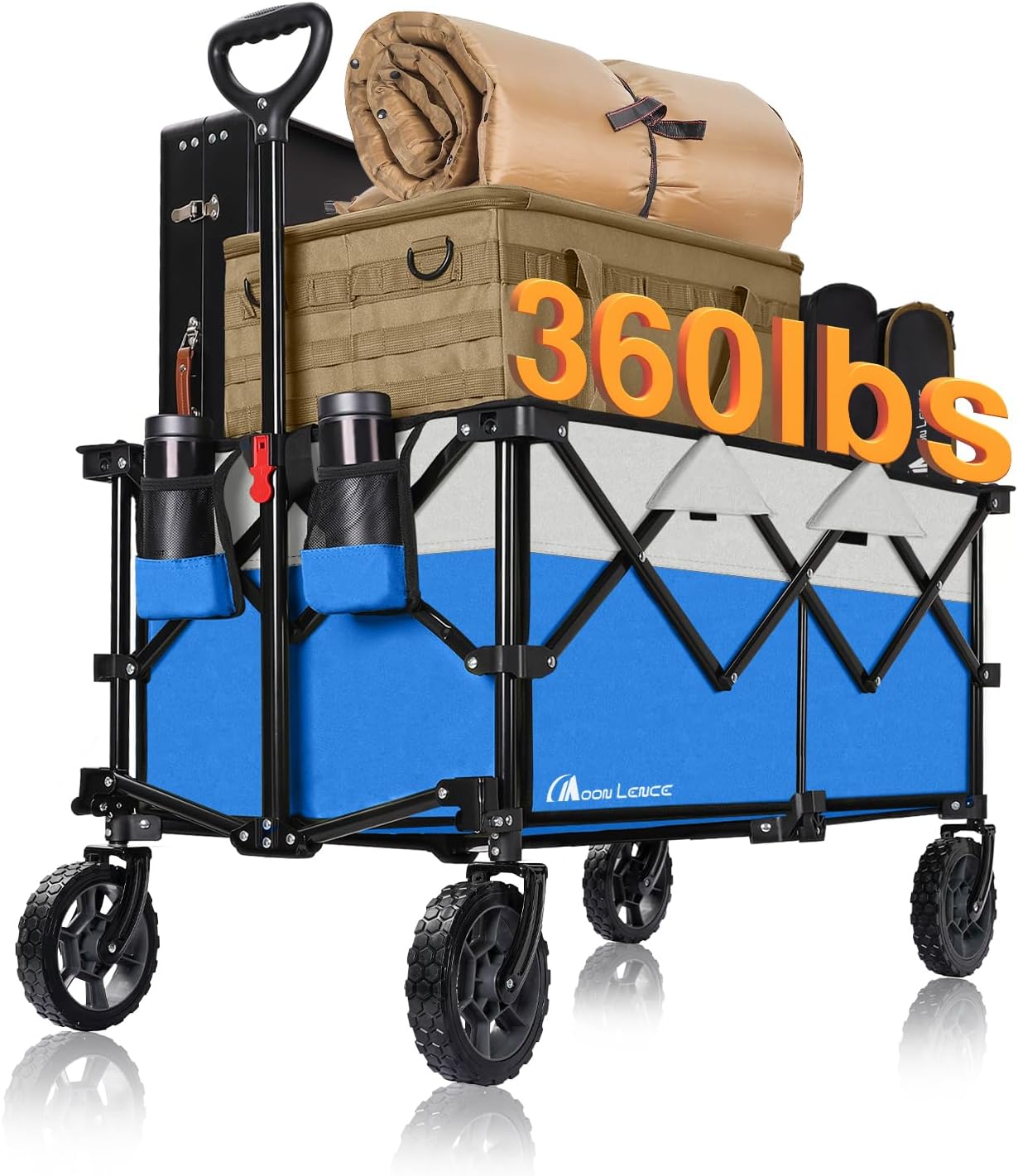 Moon Lence Collapsible Folding Wagon Cart Heavy Duty Folding Garden Portable Hand Cart with All-Terrain Beach Wheels, Adjustable Handle & Drink Holders (Blue & Ivory)