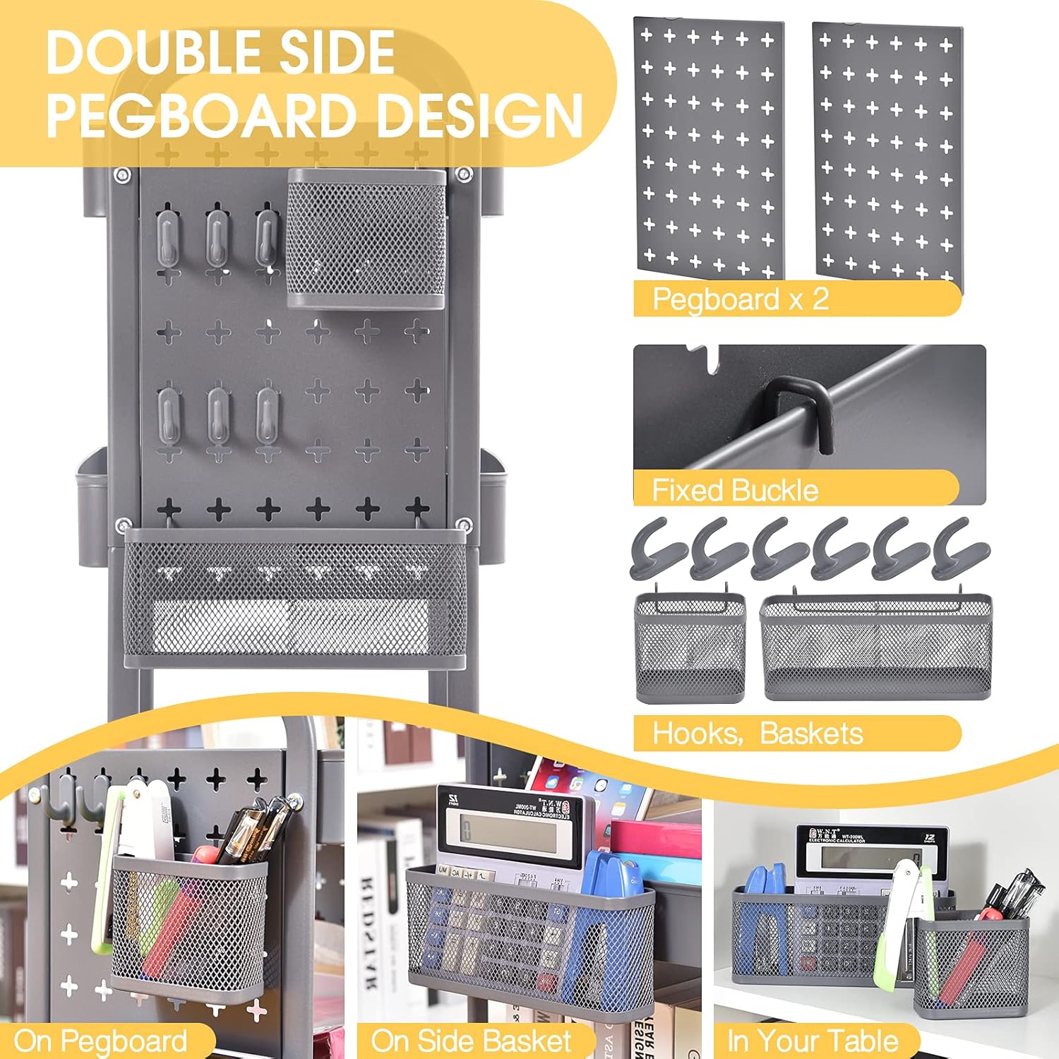 - 💦EXPLORE THE PEGBOARD for STORAGE | Compared with the ordinary trolley, our improved pegboard cart consists of perforated steel pegboard on BOTH SIDES which can DIY according to your preferences and needs! In addition 2 bins, 6 hooks are included, creating more possibilities on abundant space for variety storage.