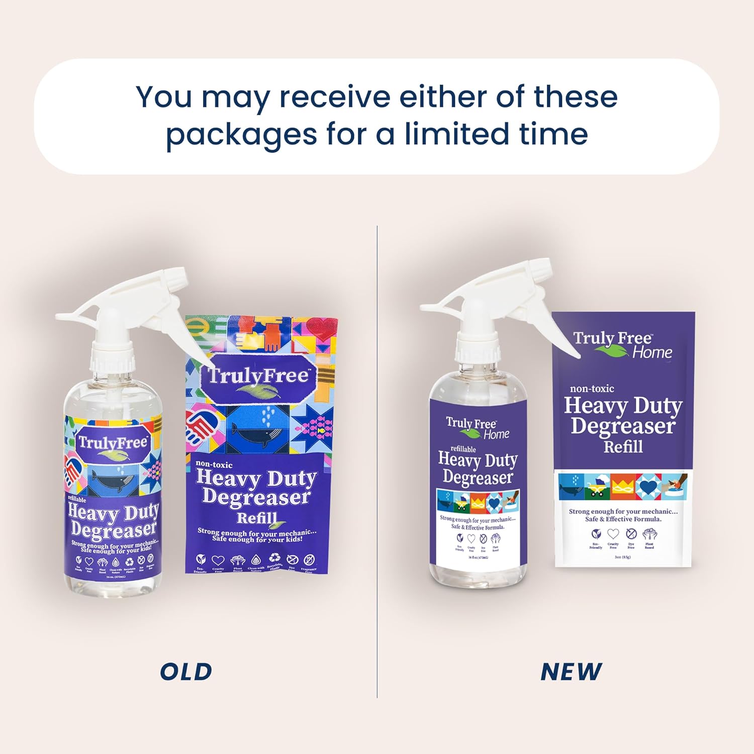 Truly Free Heavy Duty Degreaser- Grease Remover & Grime Cleaner for Kitchen, Automotive & More, Household Cleaning Supplies, Fragrance-Free, Includes 16 oz Reusable Empty Bottle & 2 Refills (4 oz)