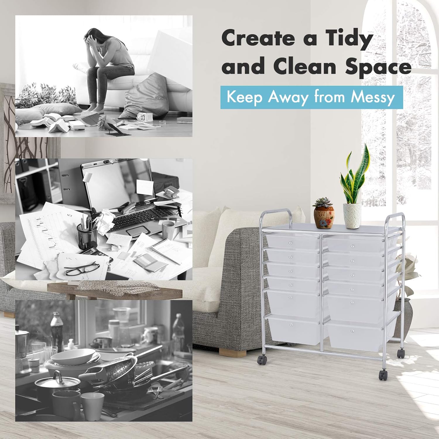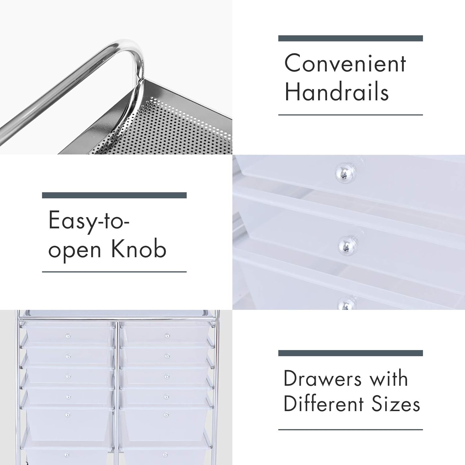 - Durable Metal Frame: The frame of this drawer storage cart is constructed of high-quality metal and processed with smooth chrome finish. The cart is sturdy and can provide long time service. In addition, the drawers are made of premium plastic but lightweight. Given the moving of cart, the whole weight of the cart is light.