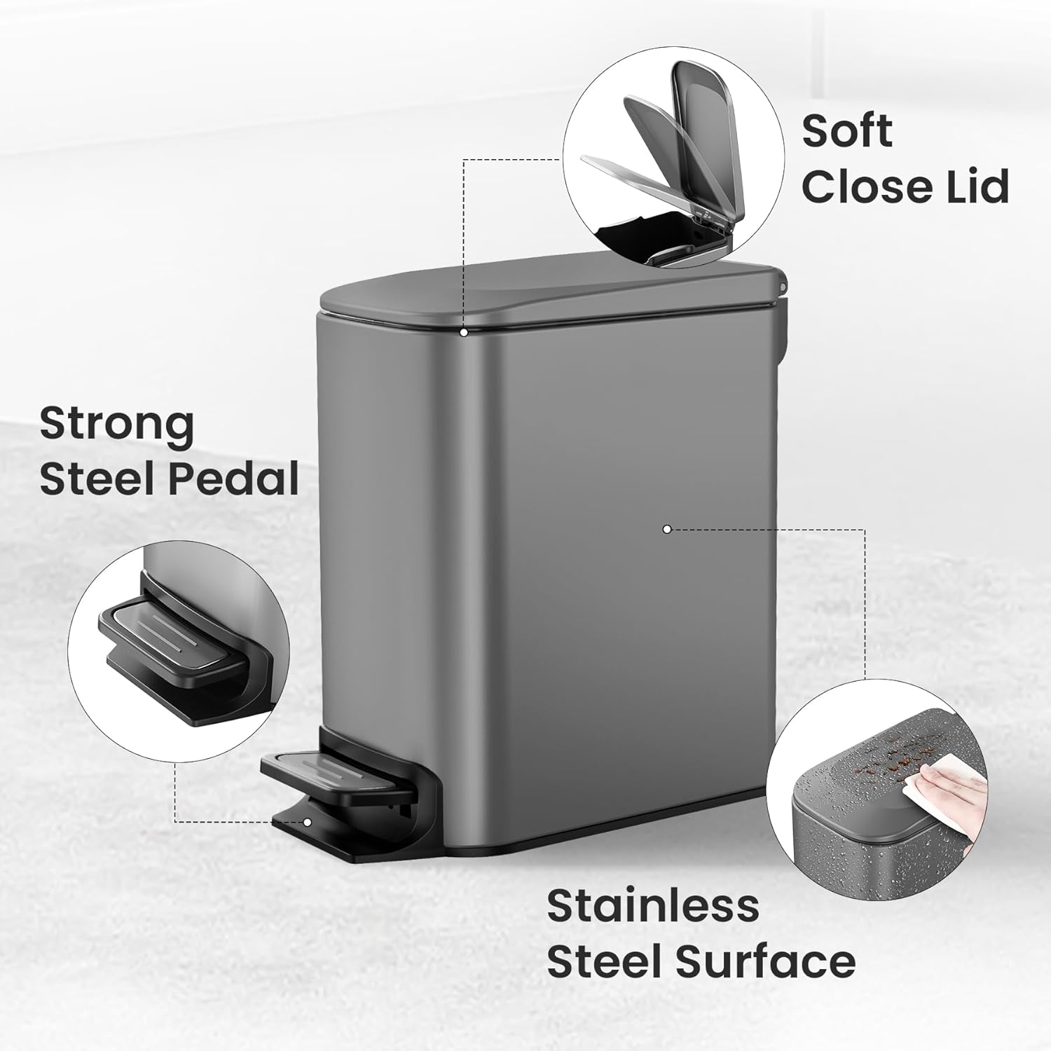 - Anti Rust & No Finger Print: The stainless steel body of the black bathroom trash can looks good, the dirt can be easily cleaned with just water and cloth, and is functional with finger print resistance, making the garbage can still looks like new after long time usage