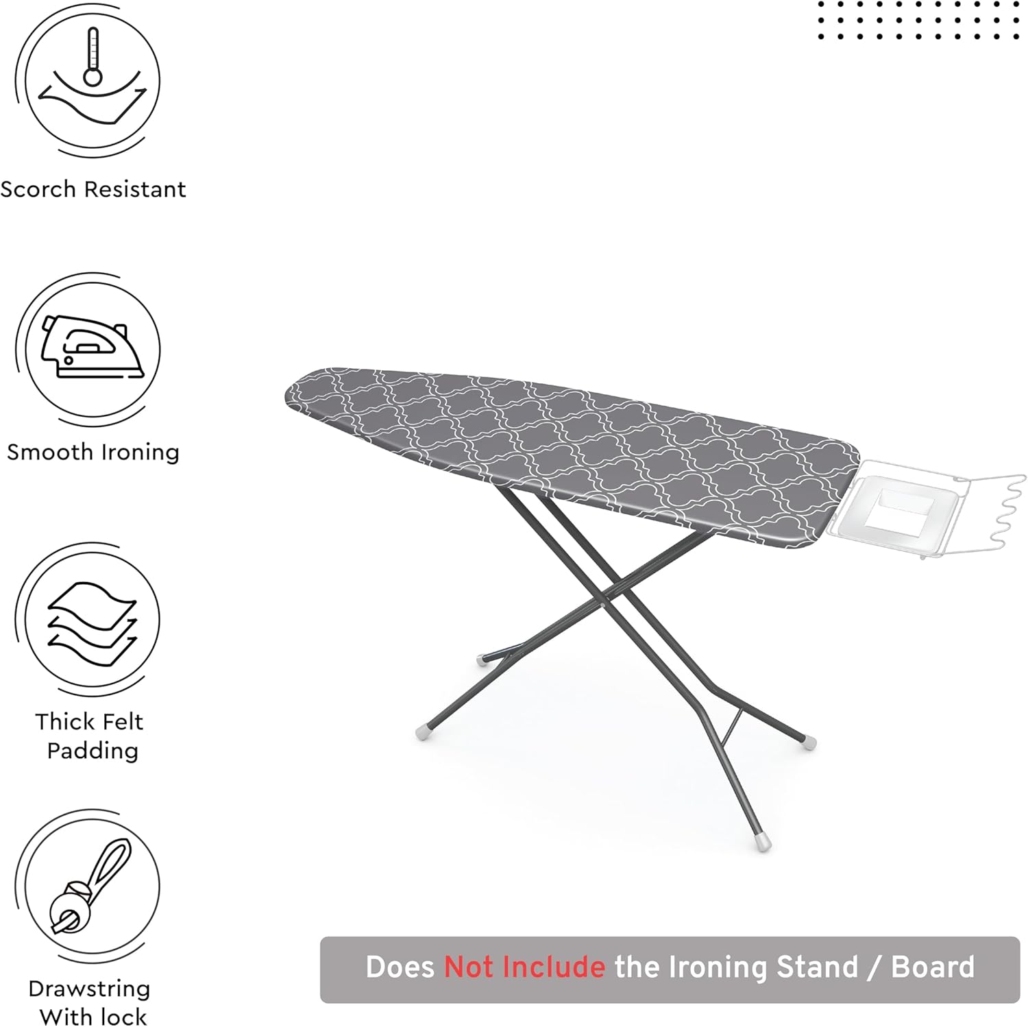 - BETTER IRONING EXPERIENCE: Encasa XO's printed ironing board covers can be fitted with a drawstring and a lock. It consists of 100% cotton fabric and 3mm felt. Get a creaseless fit as you tighten the cover around the board, giving you a wrinkle-free finish to your clothes