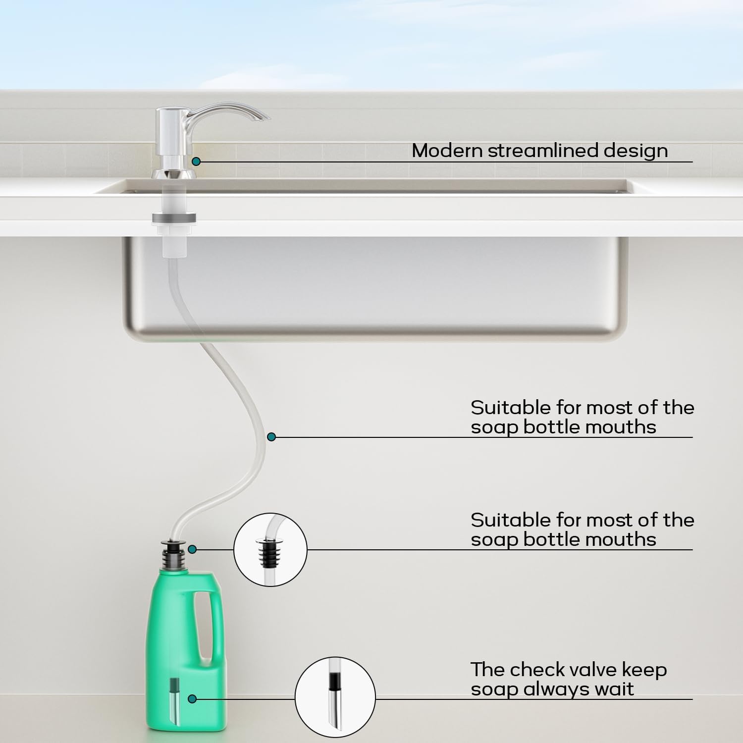 - ăVisual Coordinationă- The dispenser's design seamlessly matches most chrome kitchen faucets, enhancing the sink's aesthetic and contributing to a neater, cleaner, and more efficient kitchen.