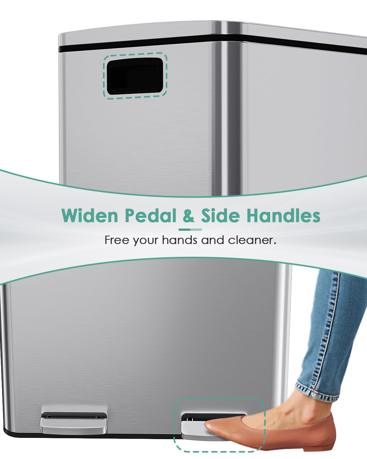 - THICK & WIDE PEDEL: Wide and thick stainless steel pedal is ergonomically designed, so you can throw out trash without bending over, and you don't need to touch the lid of the bucket when throwing out trash.