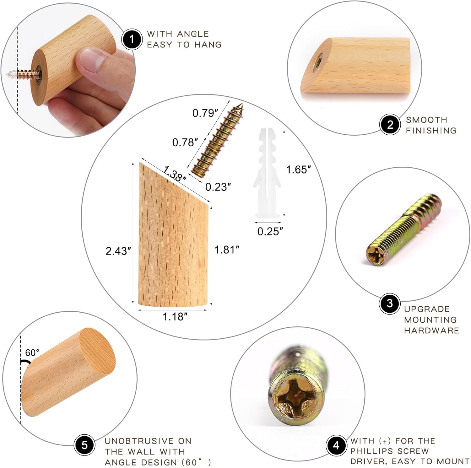 - UPGRADE INSTALLATION – We have upgraded the screw with a notch (+) for the Phillips screwdriver. So it is easier to install. 1) Drill a hole with a 5/16 bit for drywall (3/16 for stud). 2) Hammer the anchor in until it is flush with the wall. 3) Screw the metal-screw into the wall anchor with a driver. 4) Twist the wood-hook into the wall-mounted screw and tighten it to the wall with a proper angle (mounting hardware included)