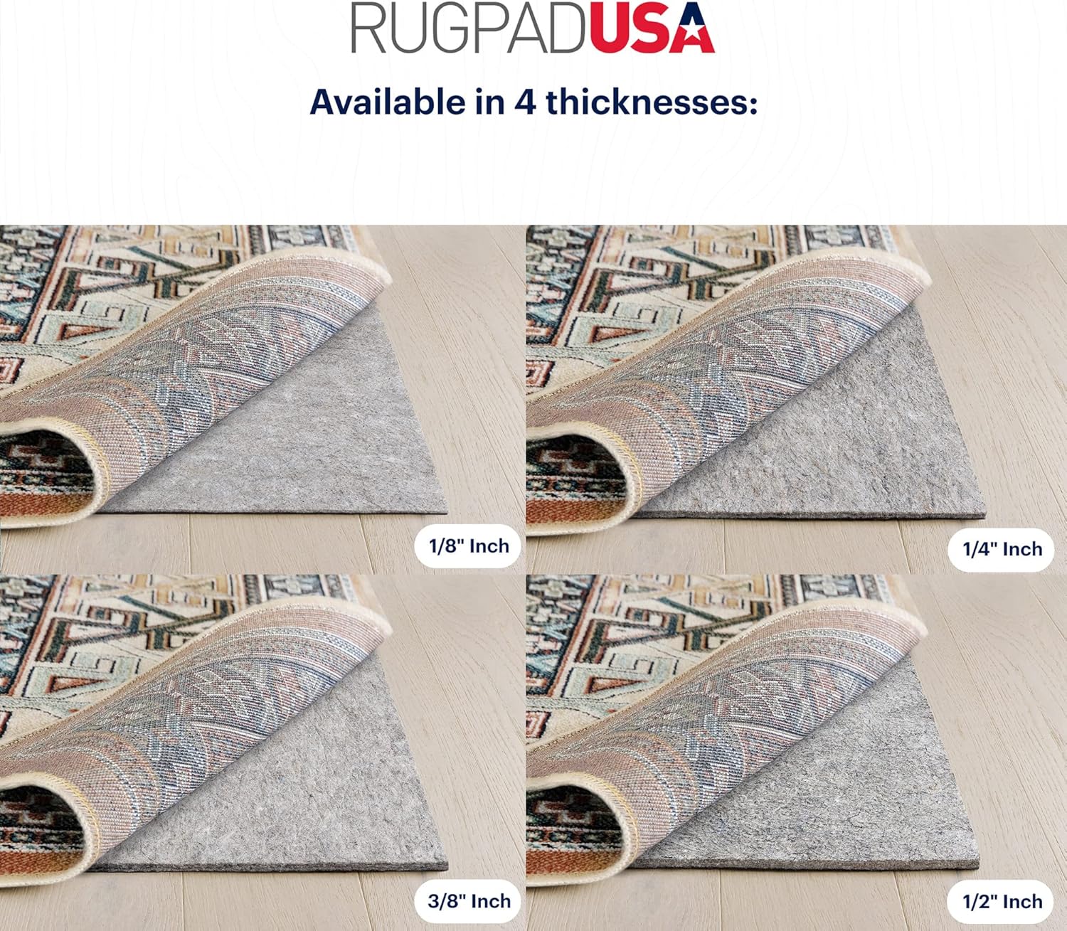 - DURABLE CUSHION - Pad contains 32oz of felt and 14oz of rubber per square yard. Thickness is approximately 3/8" throughout (actual thickness may vary slightly in production). Heat pressed felt adds soundproofing and insulation. Non-abrasive to protect rugs and floors from scratches. Adds extra comfort underneath rugs.