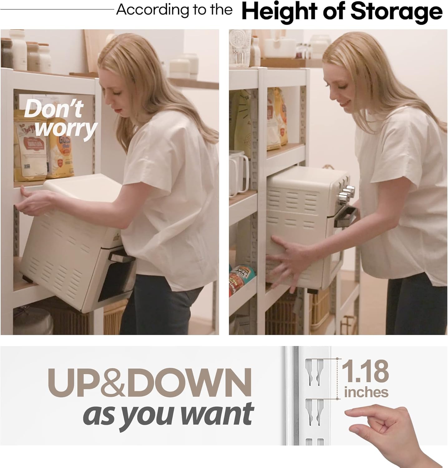 - EASY TO ASSEMBLE & HEIGHT ADJUSTABLE - You don't need any parts as plastic clips like wire shelving. You just slide and fix the frame in the post hole (a Mallet is a giveaway). Once it is put together, it can create a great deal of additional storage space without taking up too much space. Each tier can be freely adjusted the shelf up and down by the size of the item, as the hidden secret holes inside the post have grooves 1.18 inches apart. So can create customized storage space.