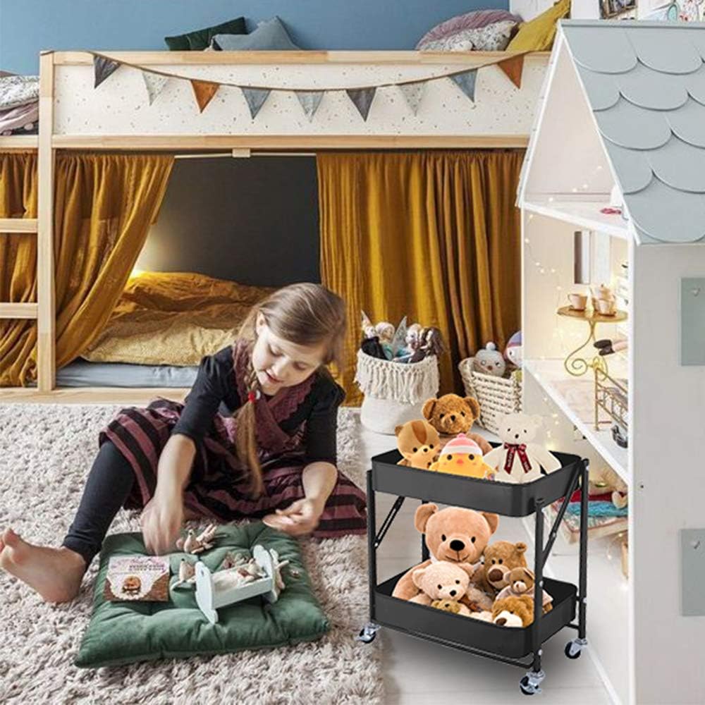 - 【Multifunctional Storage】-- This foldable 2 tier rolling storage cart has multiple functions which can be used anywhere you want it to be such as office, bathroom, kitchen, art studio, salon, garden, garages, laundry rooms hobby and craft areas and so on. It can be used as a tools cart, organization rack, sofa or bed side end table, nightstand, book cart, bedroom/living room storage cart and so on.