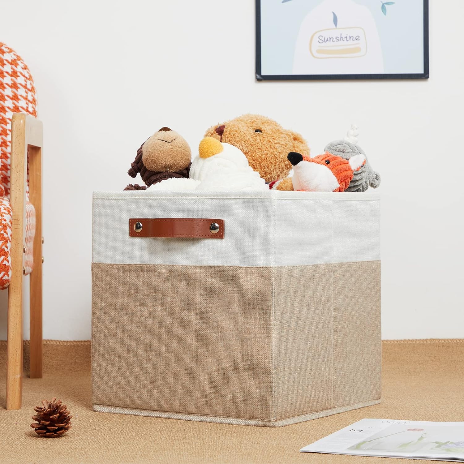- 【Sturdy Leather Handles 】Sturdy thickened leather handles and metal iron buckles make cube storage basket easy to carry even with a heavy load. Cardboard is inserted at the bottom and sides to provide support, so that these decorative storage cubes 12 x 12 to stand on, holding the shape well and can be used for a long time