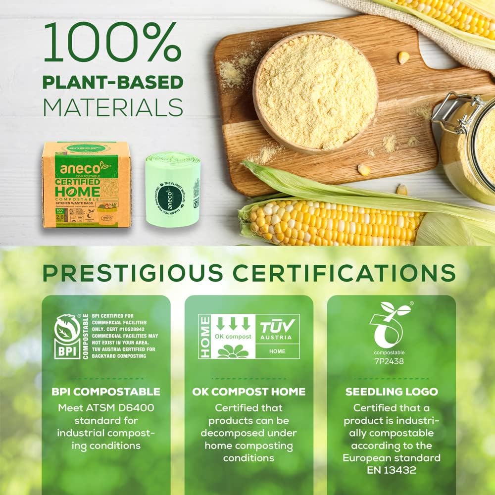 - ๐ Proud to be one of few HOME compostable trash bags in the market, ANECO Compostable bag can break down completely not only in industrial facilities but also in home system. Use these bags to collect kitchen scraps and put them straight into the compost dumpster, or bury and turn them into valuable compost for your gardendecomposes fully into CO2, water and organic biomass after 6-12 months, leaving no traces of plastic in the environment.