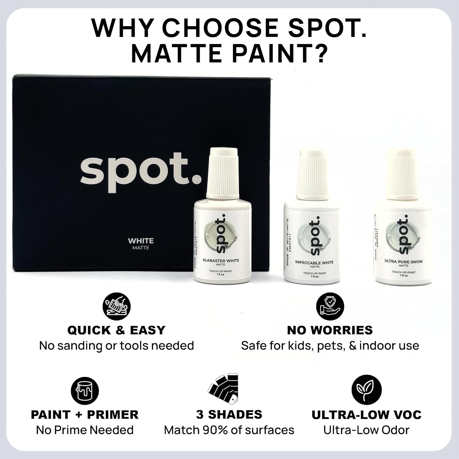 spot. Touch-Up Paint | Matte Finish for Cabinets, Walls, Doors & Furniture | Multi-Tone White Repair Kit | Quick-Dry, Self-Priming, Low-Odor, Eco-Friendly | No-Sanding or Primer Needed | 3 Pack