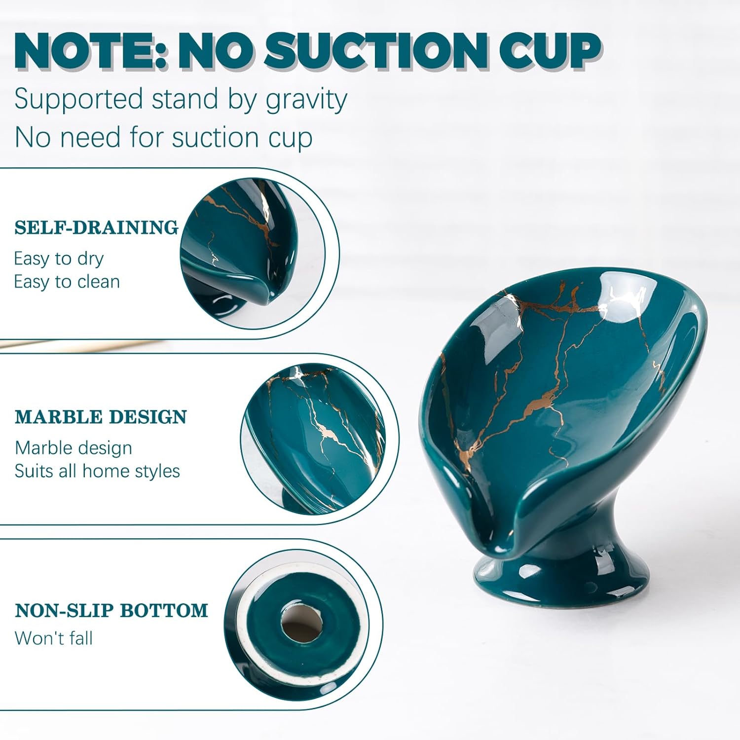 - Self-Draining Design: This ceramic soap dish features a 45° angled design inspired by lotus leaves, promoting quick drainage to keep your bar soap dry and reduce waste. The soap holder stays stable by its own weight, no need for suction cups