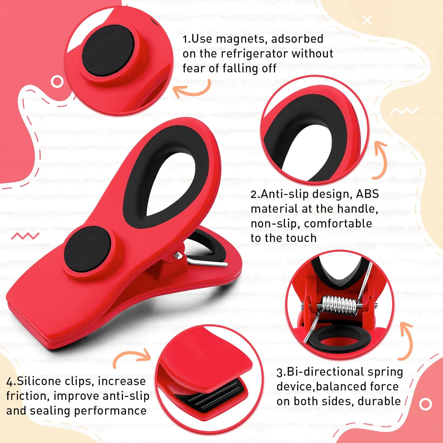 - You will receive: Set includes 12 Red magnet clips with soft touch handles - the perfect shape and size clip for all different sized bags of chips and food. sufficient quantity for you daily using and replacing demands, also nice to share with your family and friends who need it