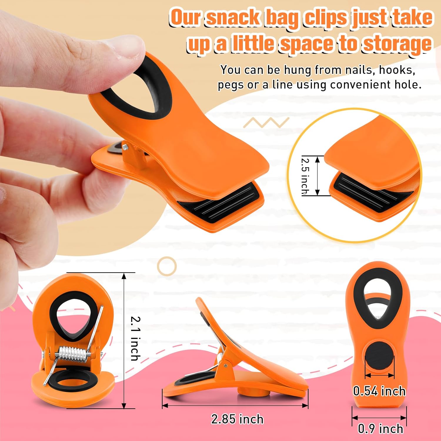 - Hang easily: the magnetic chip bag clip features a hole design in the handle part, you can hang it on the wall or any other place with a hook or a peg nail, save your space in storage room and kitchen