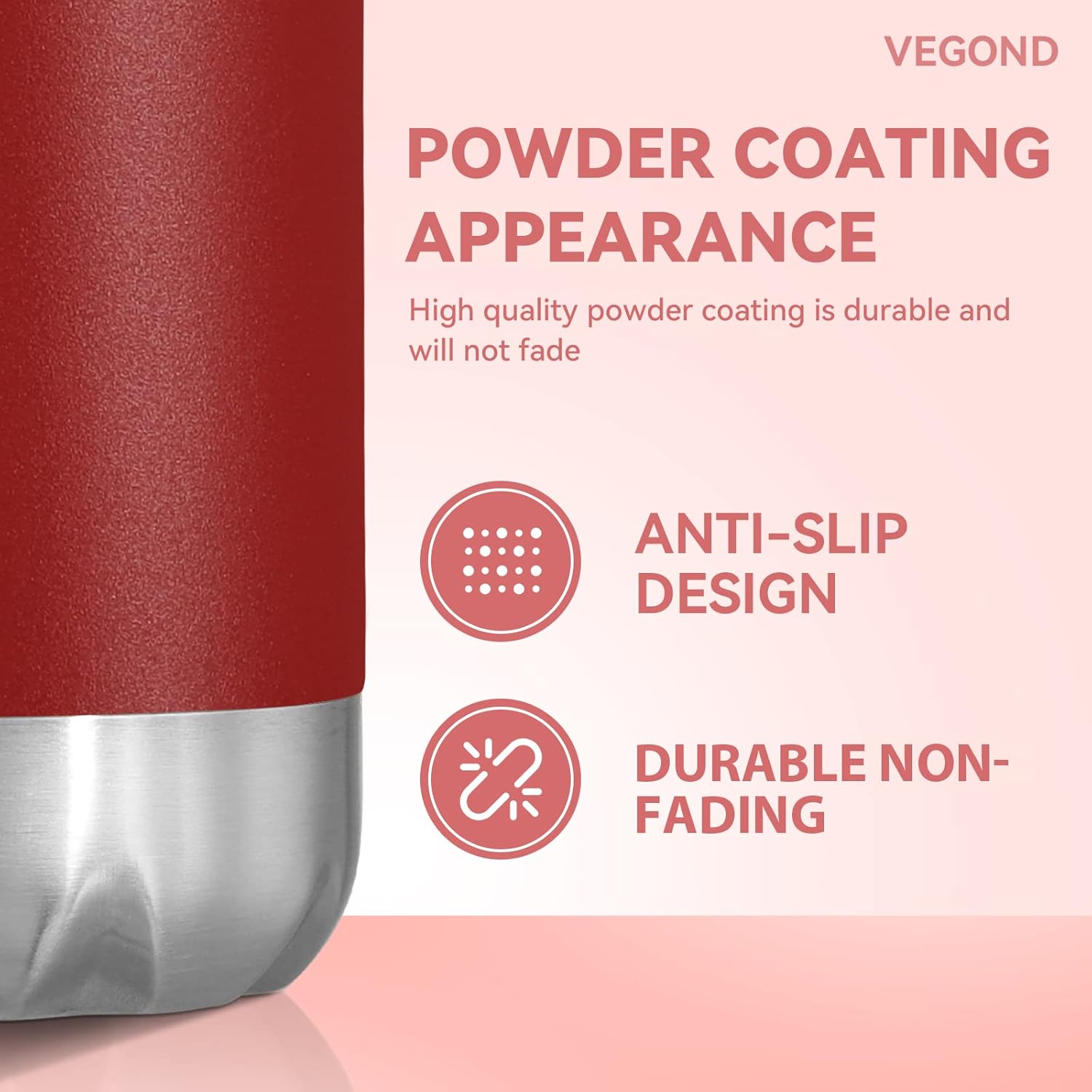 - All Day Heat / Cold Preservation : VEGOND double wall vacuum sports water bottles feature advanced heat preservation technology, keep your favorite drinks cold for up to 24 hours and hot for up to 12 hours. You can bring hot water, ice water, coffee, drinks with you. A 1.25”-diameter mouth accommodates small ice cubes and chopped fruits. The metal water bottle feature humanized design allows you to enjoy coolness in the hot summer and warmth in the cold winter