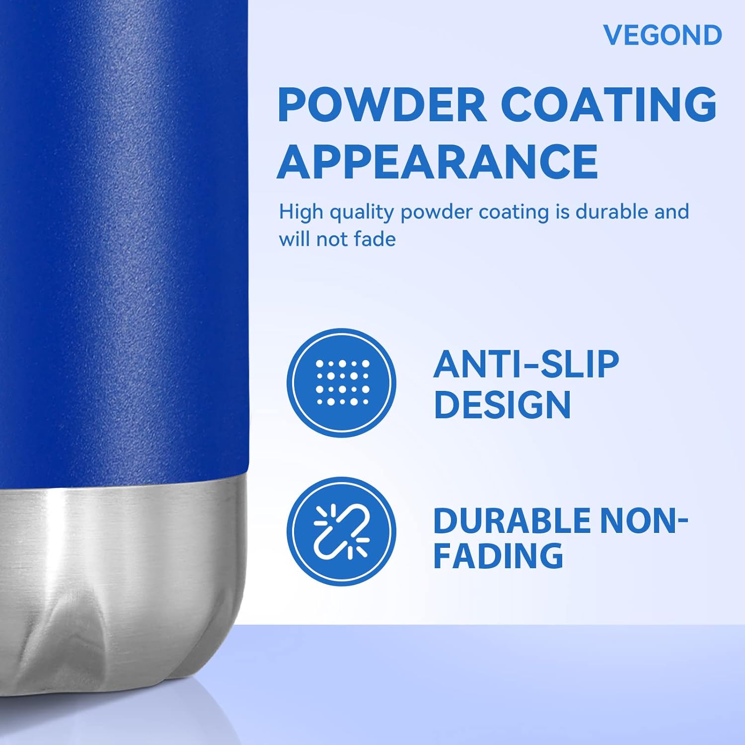 - All Day Heat / Cold Preservation : VEGOND double wall vacuum sports water bottles feature advanced heat preservation technology, keep your favorite drinks cold for up to 24 hours and hot for up to 12 hours. You can bring hot water, ice water, coffee, drinks with you. A 1.25”-diameter mouth accommodates small ice cubes and chopped fruits. The metal water bottle feature humanized design allows you to enjoy coolness in the hot summer and warmth in the cold winter