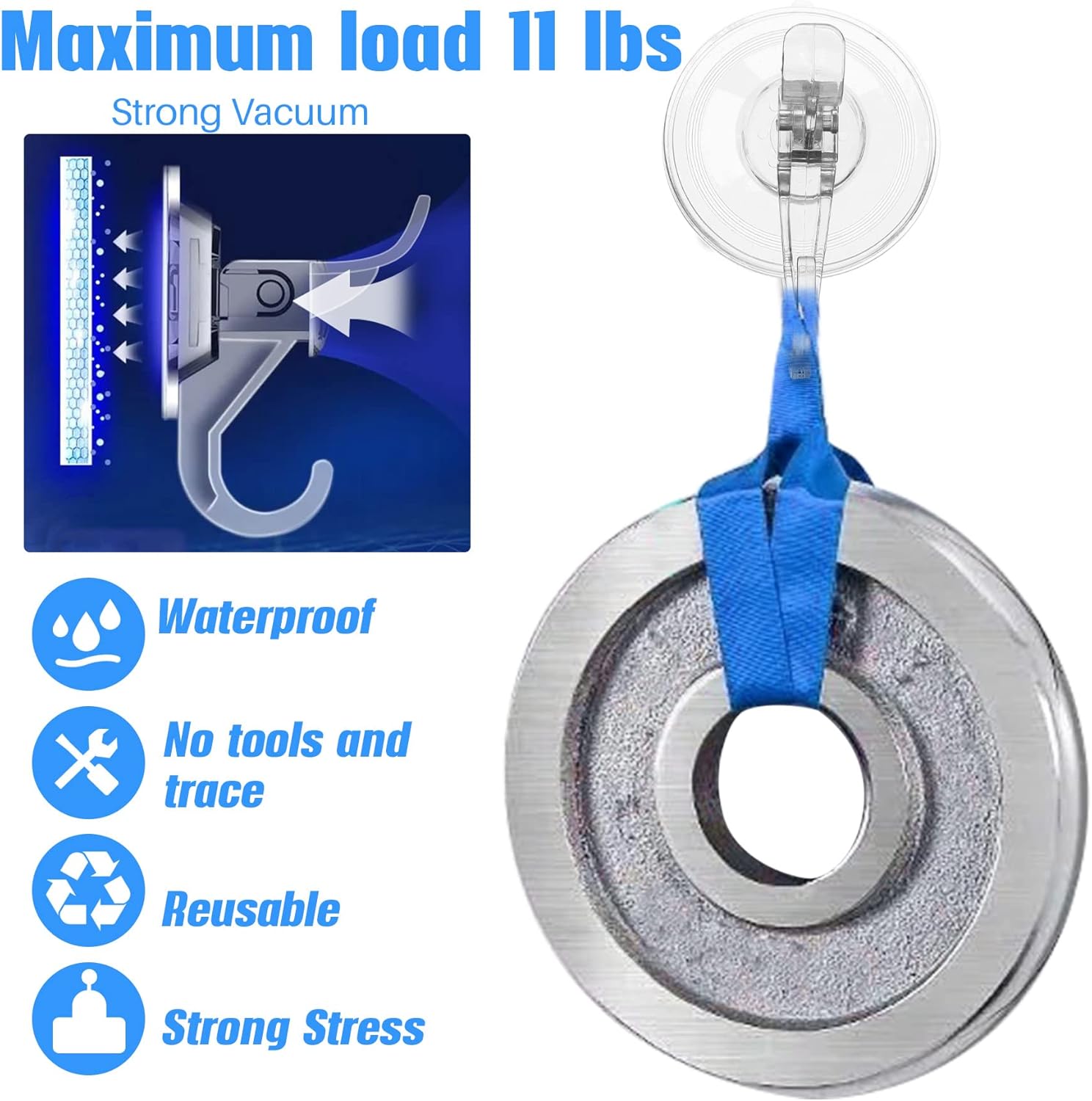 - PATENT-PENDING Dual Hooks Design【Strong Suction Power Holds up to 11 lbs on Smooth Surface】Vacuum Suction Hooks Water-resistant and Reusable. The double hook is bigger so that it is not limited to hanging small objects. Transparent design certain a convenient and versatile style