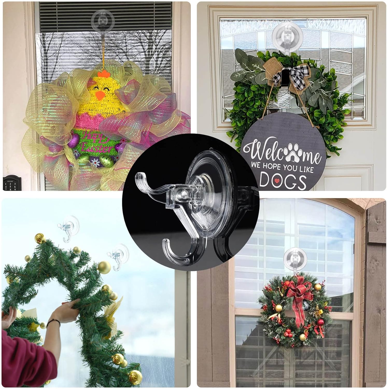 - 【Clear Hard Plastic】The Clear Suction Cup Hooks is made of premium plastic, no rust, no deformation, can perfectly organize your shower wall. Unlike Other brand in the market our suction cup hook is anti-hot-water max 158°F so your don't worry about falling off when shower hot water. Your can use it to hanging loofa, bath sponge, towel, robe, brush, clothes and more. Also suitable for outdoor glass windows Christmas wreath hanger