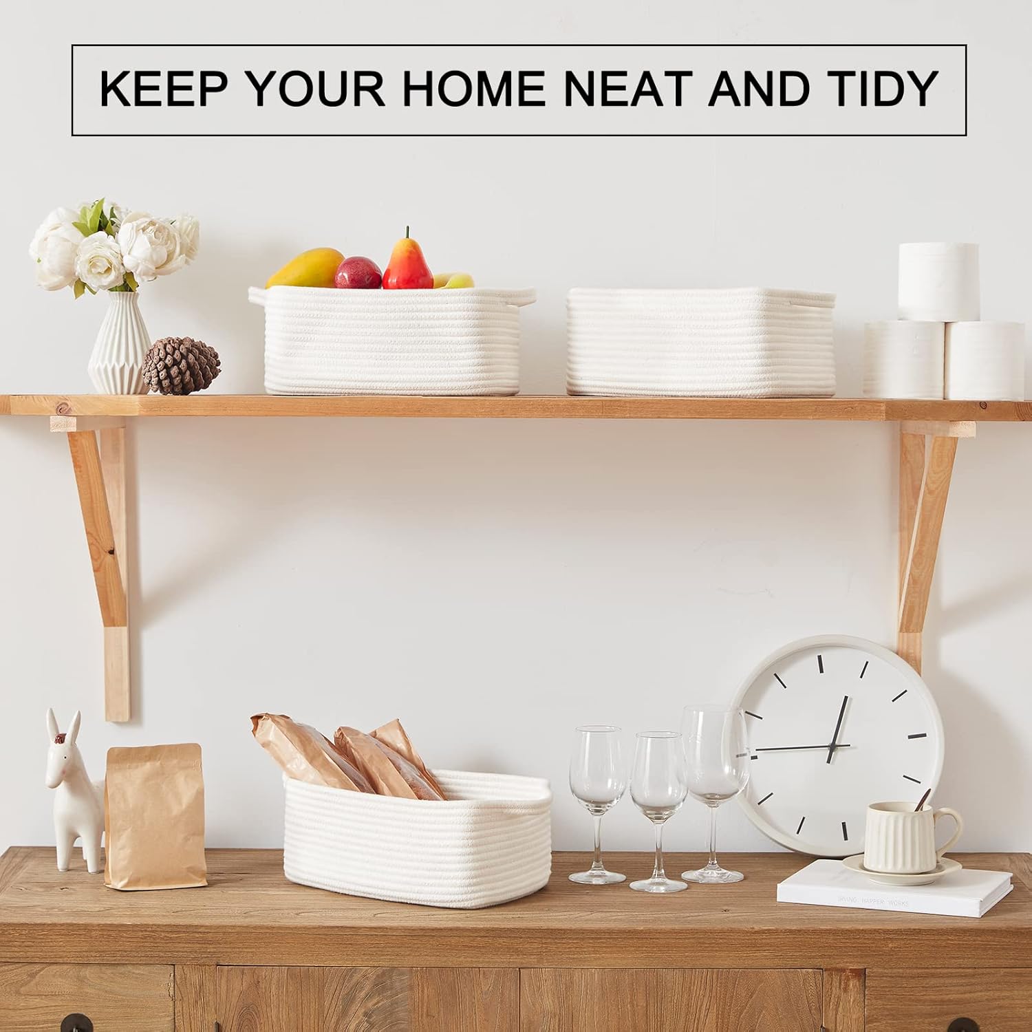 OIAHOMY Cotton Rope Storage Baskets | Decorative Storage Basket for Closet Storage, Home Organizing Bins and Nursery Decor | Cotton Rope Woven Baskets for Storage Shelf, Pure and White