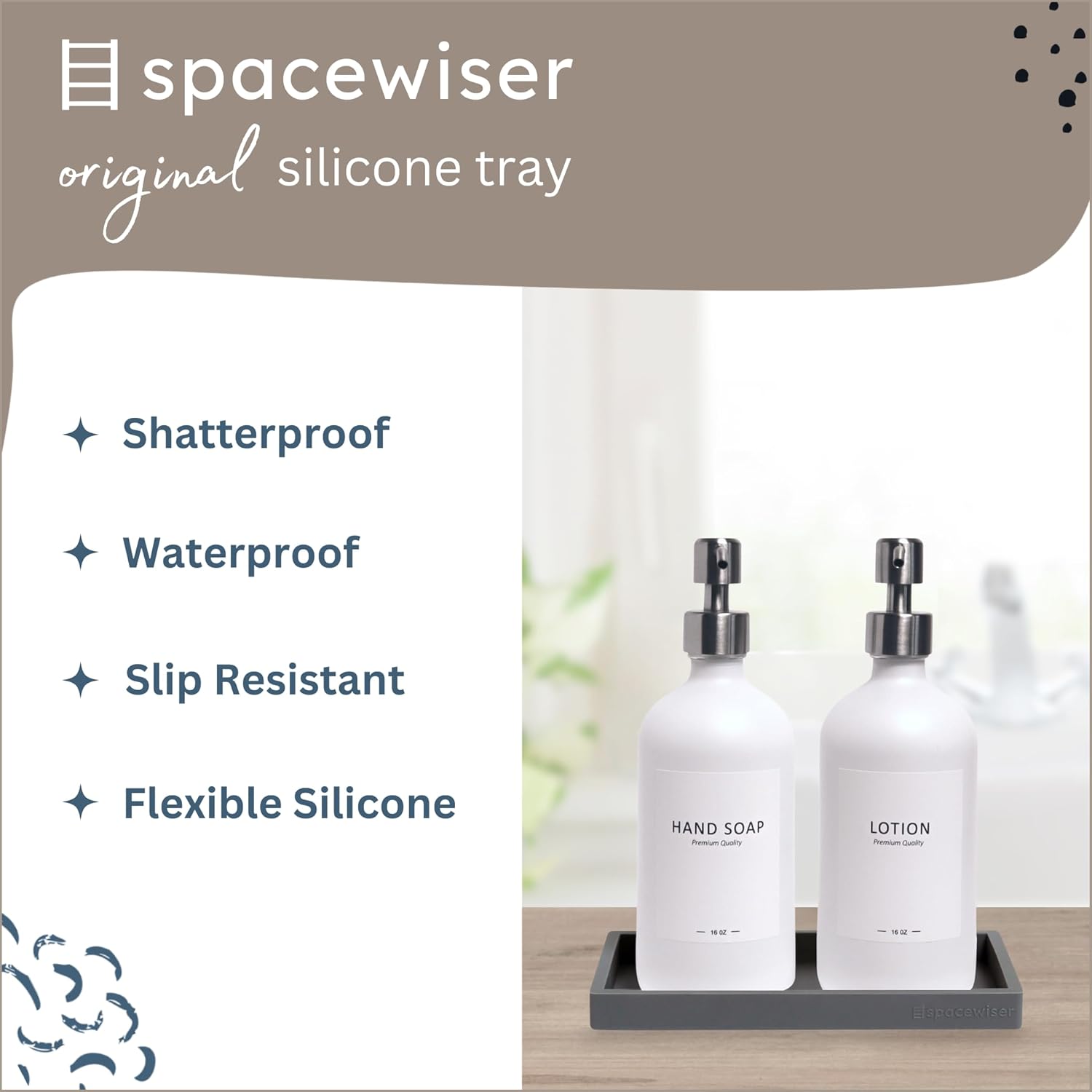 - Use It Anywhere - Choose the endlessly useful and aesthetically pleasing tray that works anywhere. The Spacewiser Original Silicone Tray is perfect as a bathroom tray, vanity tray, soap dispenser tray, kitchen soap tray or sink caddy. The trays are made of premium food grade silicone, without the addition of potentially unsafe thickening agents or chemicals. They’re shatterproof, waterproof, slip-resistant, heat resistant to 425F, and dishwasher safe- a perfect soap dish or sponge holder.