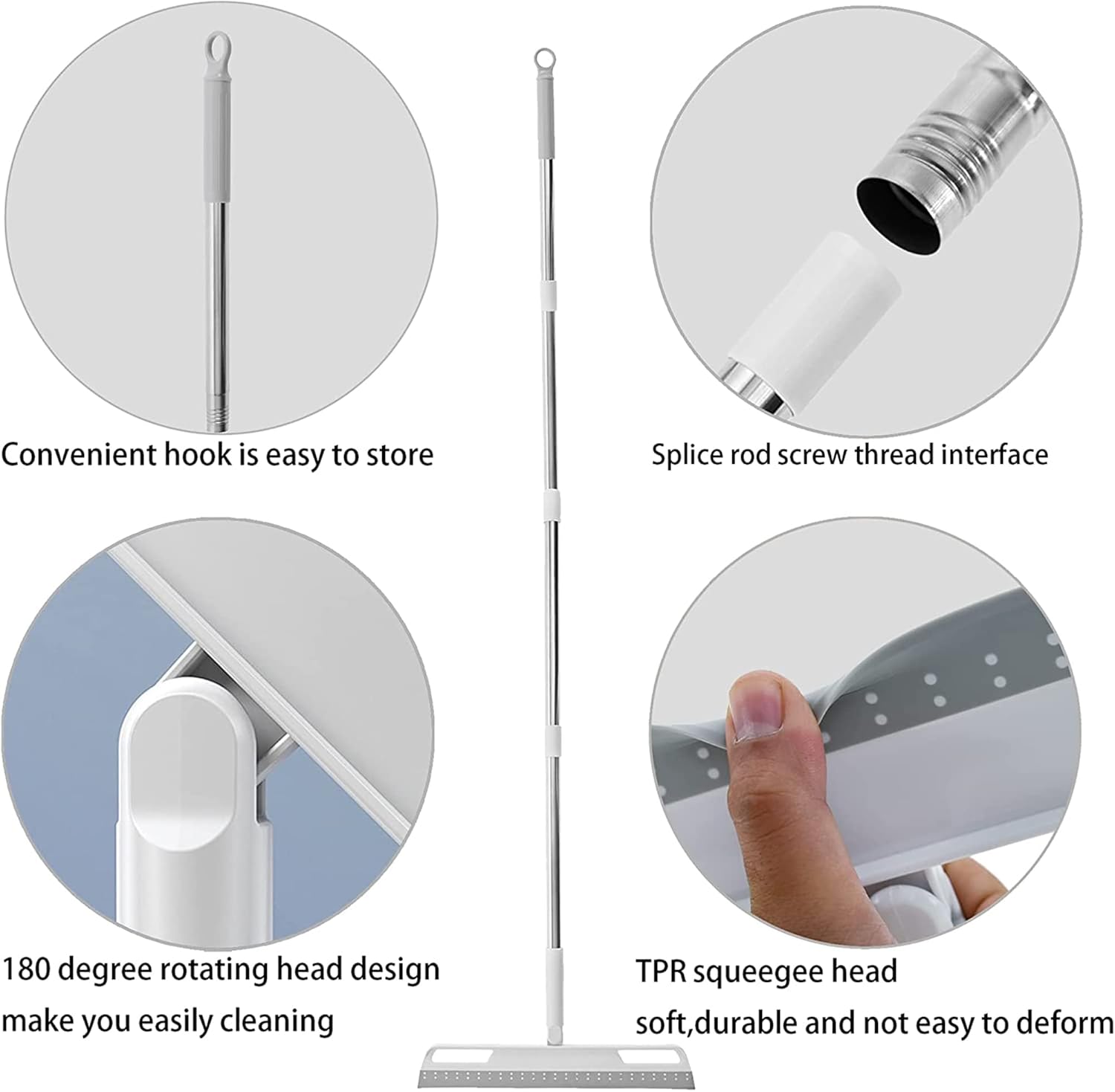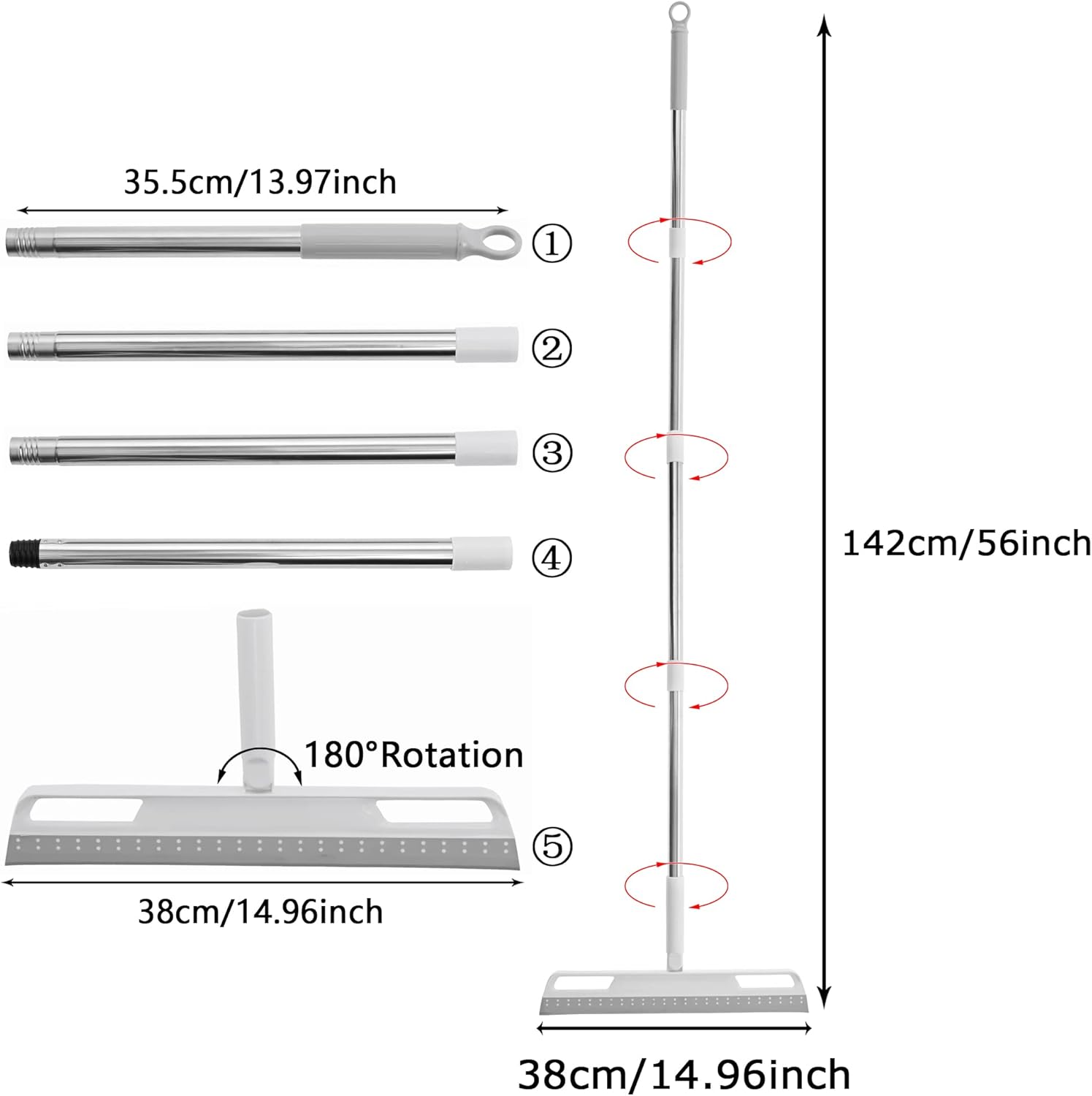 - Detachable Assembly Length: The detachable assembly length of the wiper mop is from about 56 inches for your convenience. With this feature, you can reach windows in high areas without using a step ladder and dust out underneath a couch. You can also use the short version in your bathroom to swipe out splashed water or hair strands. Scraping broom for use in kitchen, home, office or lobby.