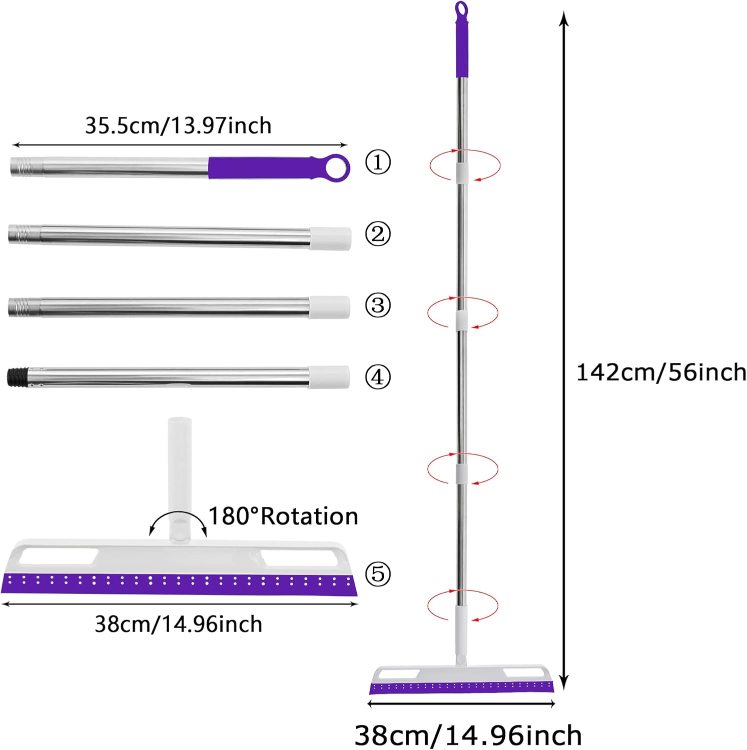 - Detachable Assembly Length: The detachable assembly length of the wiper mop is from about 56 inches for your convenience. With this feature, you can reach windows in high areas without using a step ladder and dust out underneath a couch. You can also use the short version in your bathroom to swipe out splashed water or hair strands. Scraping broom for use in kitchen, home, office or lobby.