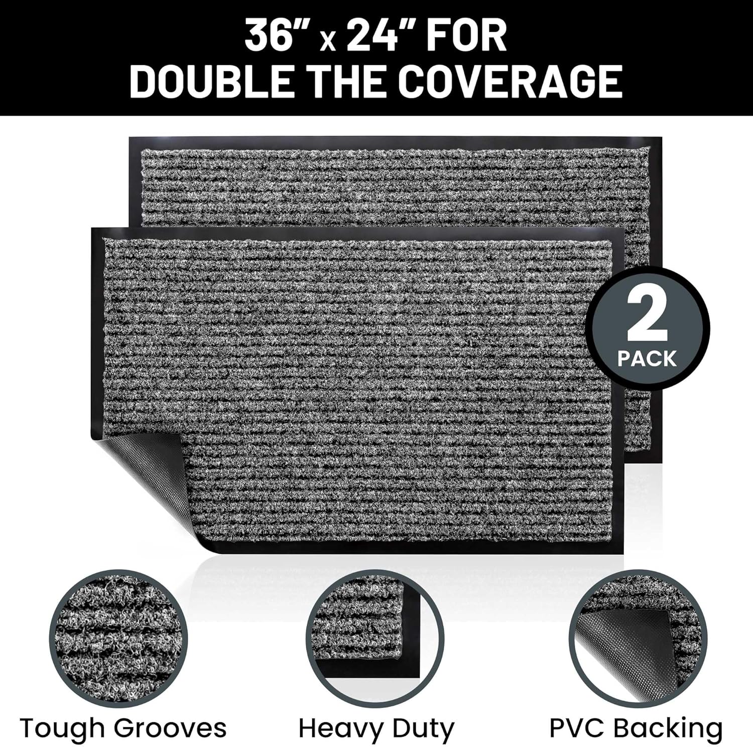 - Includes 2 Larger Indoor Outdoor Floor Mats: Enjoy two amazing heavy duty high quality ribbed polyester door mats (Larger 36" x 24") that will be perfect welcome for the everyday home. Amazing value 2-Pack.